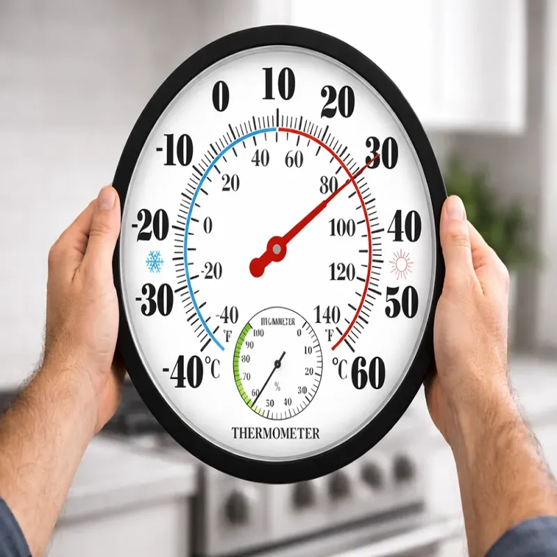 Wyraźna i czytelna skala pomiarowa umożliwia szybkie sprawdzenie temperatury w stopniach Celsjusza i Fahrenheita oraz wilgotności powietrza. Duże oznaczenia liczbowe oraz kontrastowe wskazówki sprawiają, że odczyt jest bardzo wygodny nawet z dalszej części pomieszczenia.