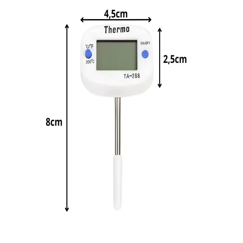 Termometr ma kompaktową konstrukcję i około 8 cm długości, dzięki czemu zajmuje bardzo mało miejsca w szufladzie kuchennej lub organizerze na akcesoria kuchenne. Mały rozmiar ułatwia również przechowywanie oraz transport.