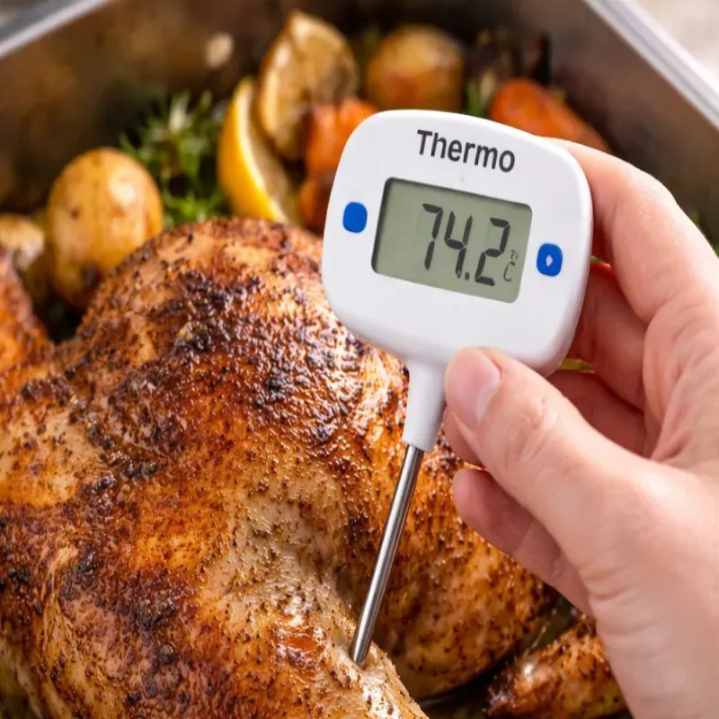 Metalowy szpikulec pozwala na wygodne wbicie termometru w mięso, ciasto lub inne potrawy, aby sprawdzić temperaturę wewnątrz. To praktyczne rozwiązanie podczas przygotowywania steków, pieczeni, kurczaka czy grillowanych potraw.