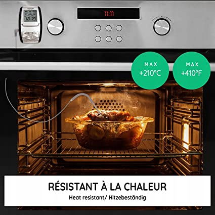 Praktyczne zastosowanie: pudełko magnetyczne z tyłu przechylanej sondy można umieścić poza piecem lub złożyć na blacie roboczym. Wbudowany timer dzwoni na końcu procesu gotowania.