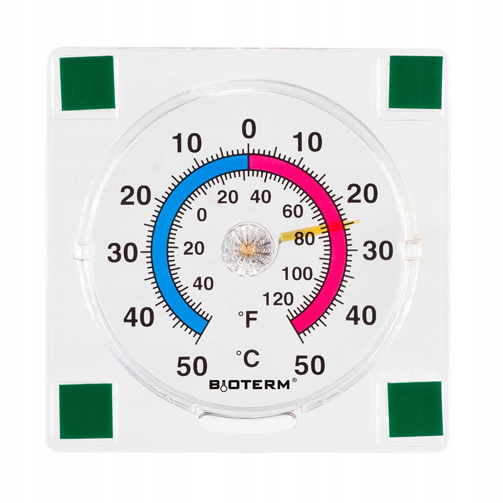 Termometr bimetaliczny w kształcie kwadratu wykonany z przezroczystego tworzywa. Skala nadrukowana jest bezpośrednio na plastiku. Odczytu temperatury można dokonać zarówno w stopniach Celsjusza (zewnętrzna skala), jak i stopniach Fahrenheita (skala wewnętrzna). Na brzegach termometru znajdują się kawałki taśmy samoprzylepnej, co sprawia, że termometr po przymocowaniu jest bardzo stabilny.