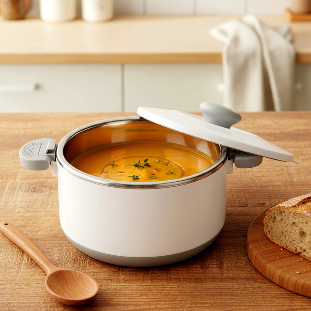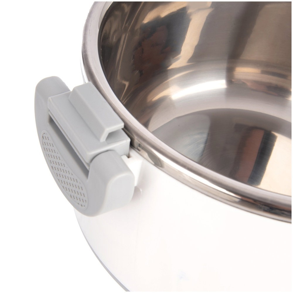 Wykonana ze stali nierdzewnej - Termomisa wewnątrz wykonana jest ze stali nierdzewnej. Zewnętrzna obudowa wykonana jest z tworzywa w białym kolorze. Uchwyty są w kolorze szarym.