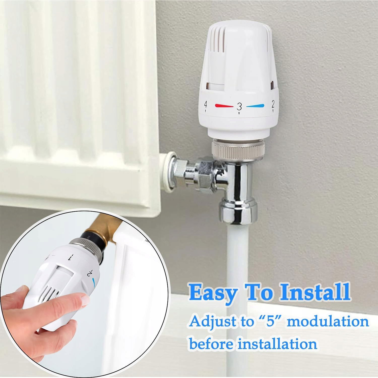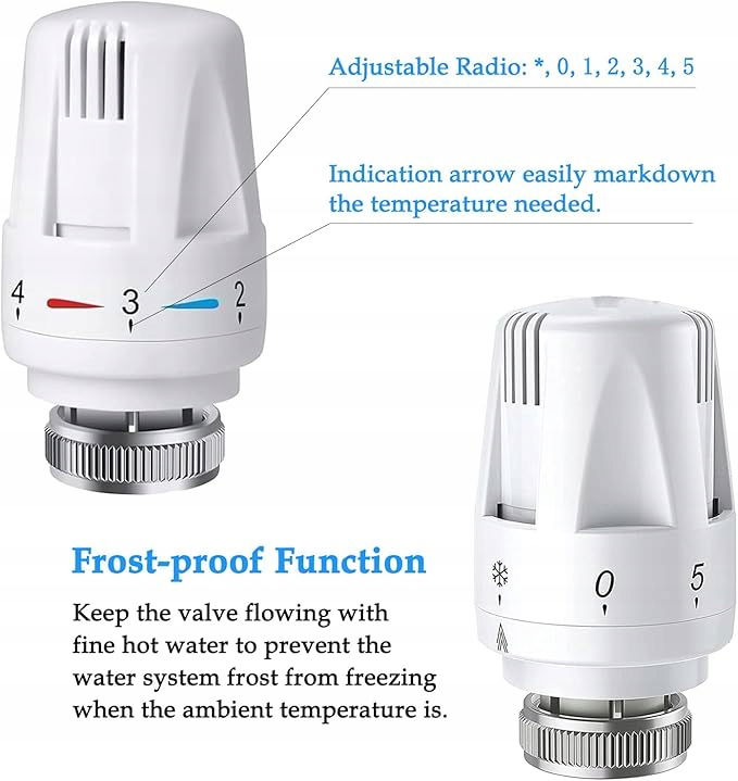- 5 poziomów modulacji temperatury: Termostatyczny grzejnik ma 5 poziomów do regulacji temperatury. może zapewnić ochronę przed zamarzaniem i funkcję regulacji. Jeśli chcesz wyłączyć termostat, po prostu użyj strzałki indeksu modulacji 0.