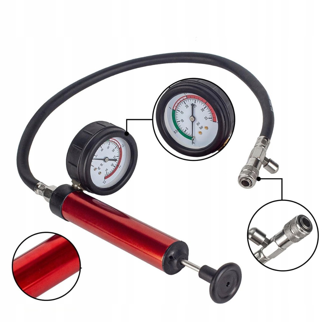 - Napełnianie chłodziwa i pomiar ciśnienia: zakres pomiaru wynosi od -30 do 0 inHg (-76 do 0 cmHg), przy czym zwykle wartość -25 do -20 inHg jest odpowiednia do uzupełniania chłodziwa. Tester wycieków nakłada ciśnienie na zbiornik lub korek, a spadek wskazania wskaźnika sygnalizuje obecność nieszczelności w układzie chłodzenia.