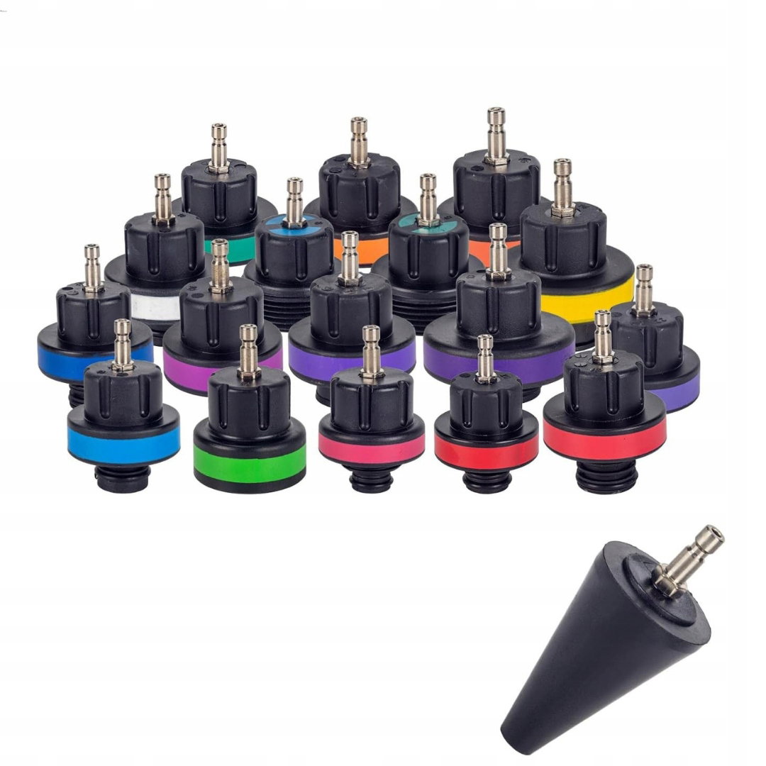 - Adaptery do chłodnicy: zestaw zawiera 17 specjalnych adapterów do chłodnic, 1 uniwersalny adapter stożkowy oraz 3 aluminiowe nakrętki do sprawdzania szczelności i uzupełniania chłodziwa. Pasuje do niemal wszystkich typów wlewów chłodnic w pojazdach zarówno klasycznych, jak i nowoczesnych. Informacje o kompatybilnych modelach pojazdów dla każdego adaptera znajdują się w opisie oraz w instrukcji obsługi (język angielski nie jest gwarantowany).
