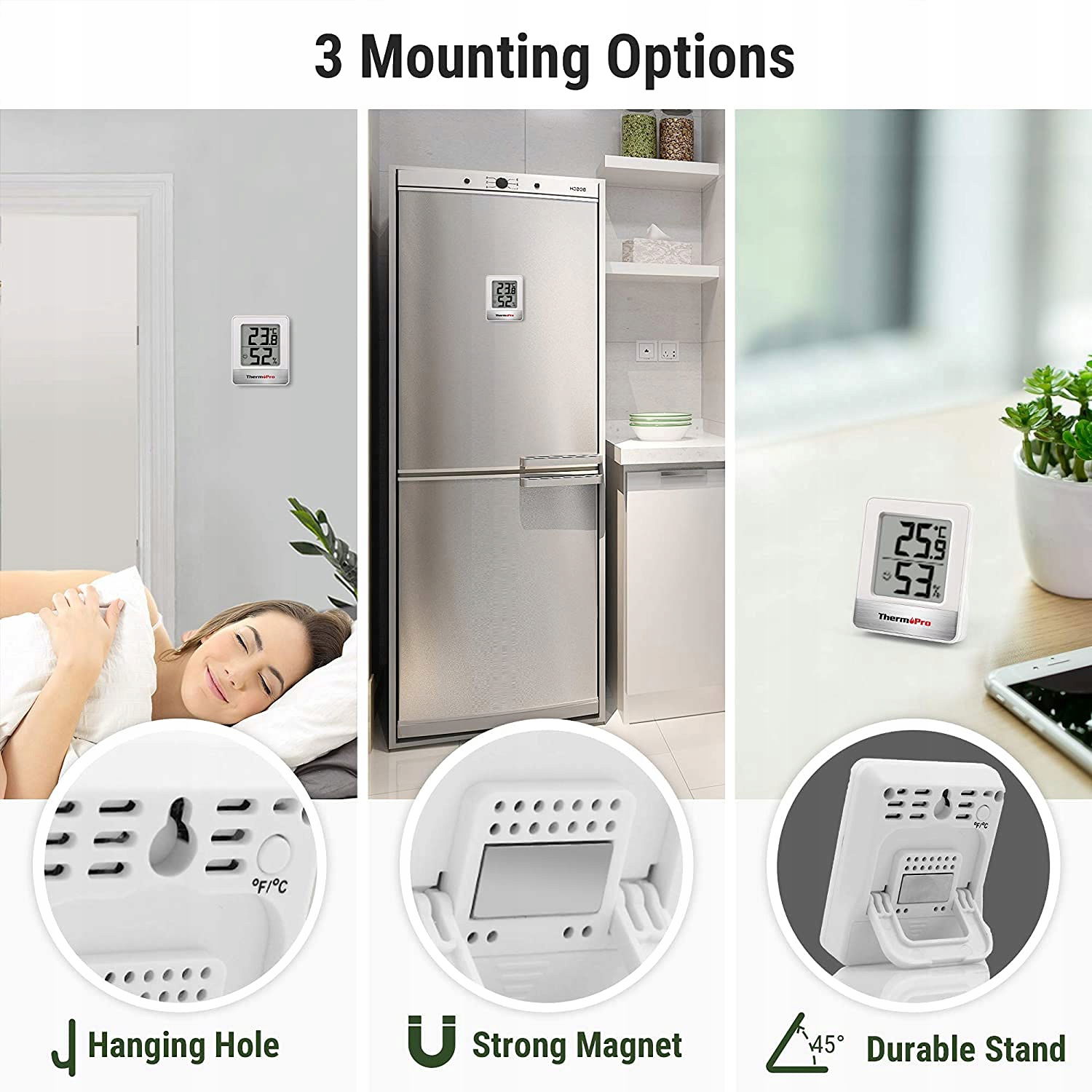 Elastyczne opcje montażu: postaw na biurku, zawieś na ścianie lub zamocuj na metalowej powierzchni. Rozpocznij użytkowanie od razu dzięki dołączonej baterii AAA.