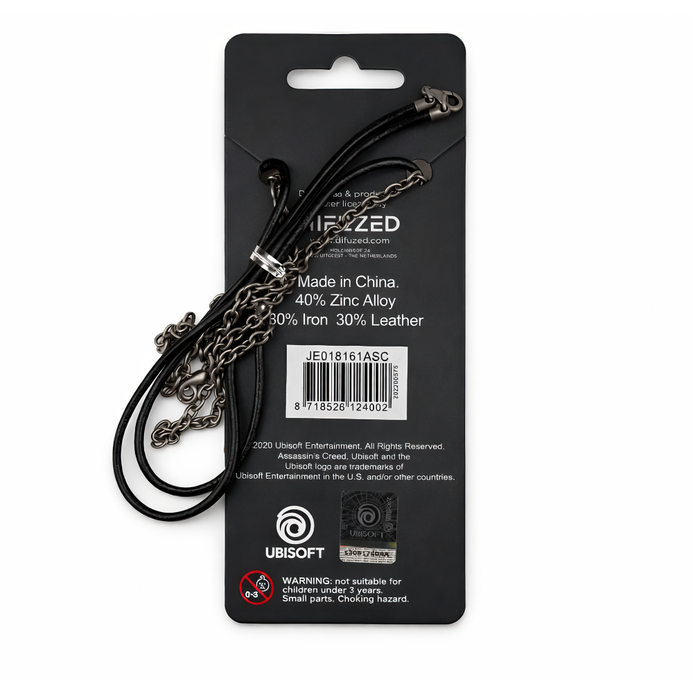 W lodowatych fiordach Assassin’s Creed Valhalla moc nie jest „dawana” — trzeba ją sobie wywalczyć, a Thor’s Hammer pozwala nosić ten nordycki klimat przy sobie na co dzień. To wyrazisty, 10-centymetrowy metalowy pendant w formie stylizowanego Mjölnira, w chłodnym, srebrnym odcieniu, z mocnymi czarnymi, zagłębionymi liniami układającymi się w ostre węzły i geometryczne panele. Ten dwukolorowy kontrast sprawia, że wzór od razu rzuca się w oczy, a „tarczowy” obrys młota daje mu konkretną obecność — czy masz go na sobie, czy stoi na ekspozycji. Na froncie widać czyste fazowania, warstwowy relief i drobne nity, więc całość wygląda jak runiczne wyposażenie z sagi Eivora i świetnie pasuje do ikonografii znanej z gry. Zawieszony na czarnym rzemieniu z krótkim metalowym łańcuszkiem i zapięciem, siedzi pewnie i robi robotę na cosplayu, konwencie albo po prostu podkręca zwykłą kurtkę w styl „raid-ready”. Na firmowej zawieszce widać oznaczenia Difuzed i Ubisoft, co wskazuje na oficjalnie licencjonowany produkt. Możesz trzymać go na biurku dla szybkiego „viking vibe”, nosić na t-shircie albo sprezentować komuś, kto lubi kolekcjonować noszone symbole z serii. Dorzuć go do codziennego zestawu i zabierz ze sobą — gdziekolwiek poniesie cię następna wyprawa.