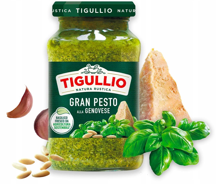 Historia pesto Tigullio wywodzi się z zamiłowania do składników i najpopularniejszych włoskich receptur: zapach 100% włoskiej świeżej bazylii, delikatność Parmigiano Reggiano DOP, bez dodatku konserwantów i barwników. Kremowe i o intensywnym smaku idealnie nadaje się do codziennego tworzenia pysznych dań.