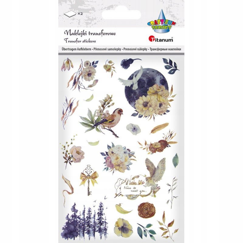 Naklejki transferowe księżyc, las, ptak, koło zębate, bukiety 2 plansze.Świetnie nadają się do wszelkiego rodzaju dziecięcej aktywności twórczej, jak również do zdobienia projektów kreatywnych takich jak kartki okolicznościowe, albumy, pudełka, opakowania prezentów i wielu innych.Instrukcja: wytnij element, który chcesz użyć, usuń tylną, przezroczystą folię, przyklej element do powierzchni, dociśnij go - a następnie potrzyj, usuń przednią, przezroczystą folię.