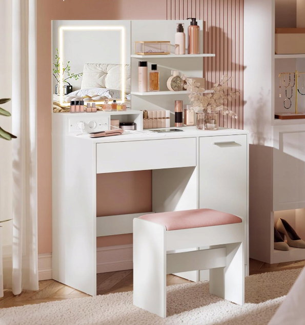 - ✴️Dużo miejsca: Perfumy i kremy na dwóch półkach, prostownica w szufladzie, płyn do demakijażu w dolnej szafce. Wszystkie kosmetyki mają swoje miejsce.