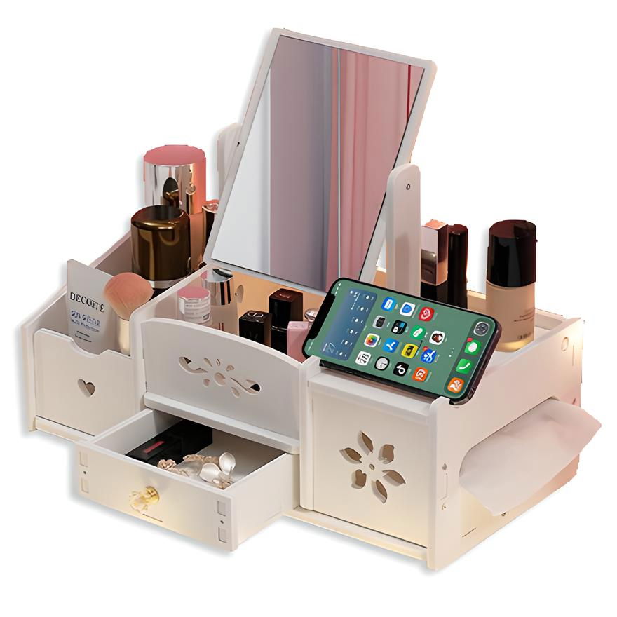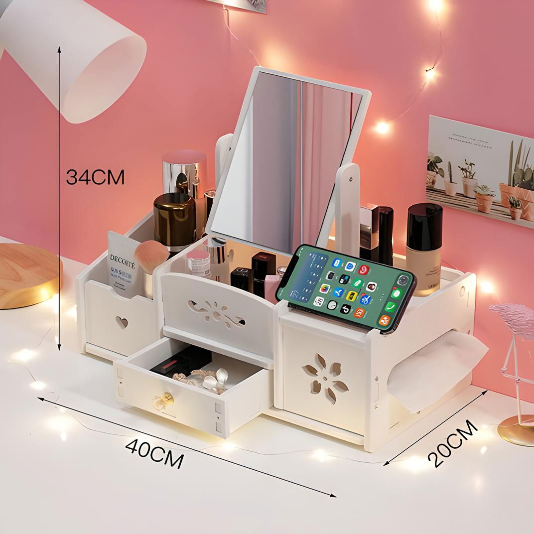 ✔️ Wyposażona jest w szufladki oraz półki, które idealnie nadają się do przechowywania kosmetyków, pędzli czy biżuterii.