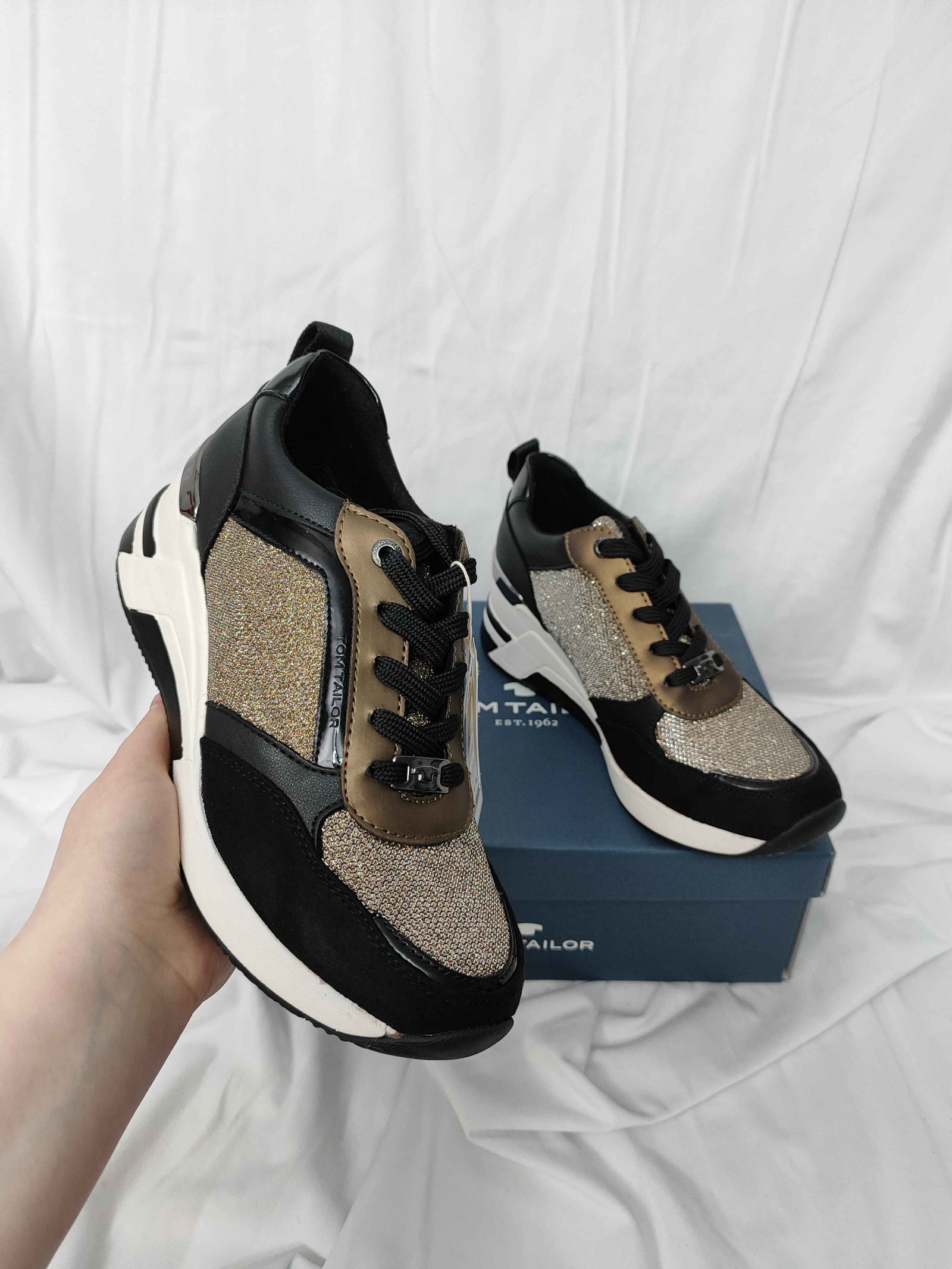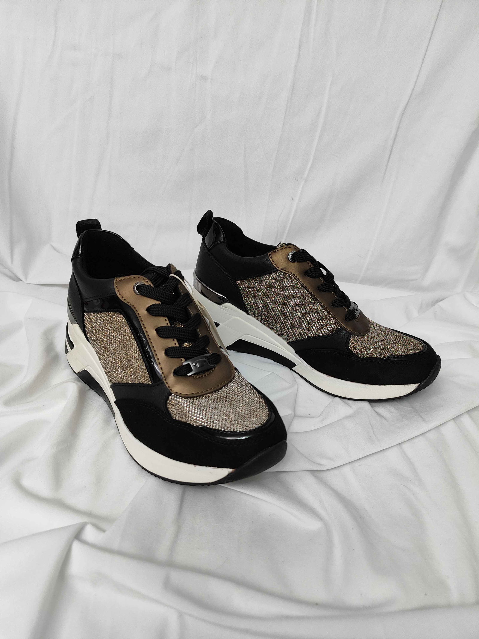 Mają delikatne fałdki na pięcie przez trzymanie w kartonie oraz lekkie przetarcie metalu z logo z tyłu