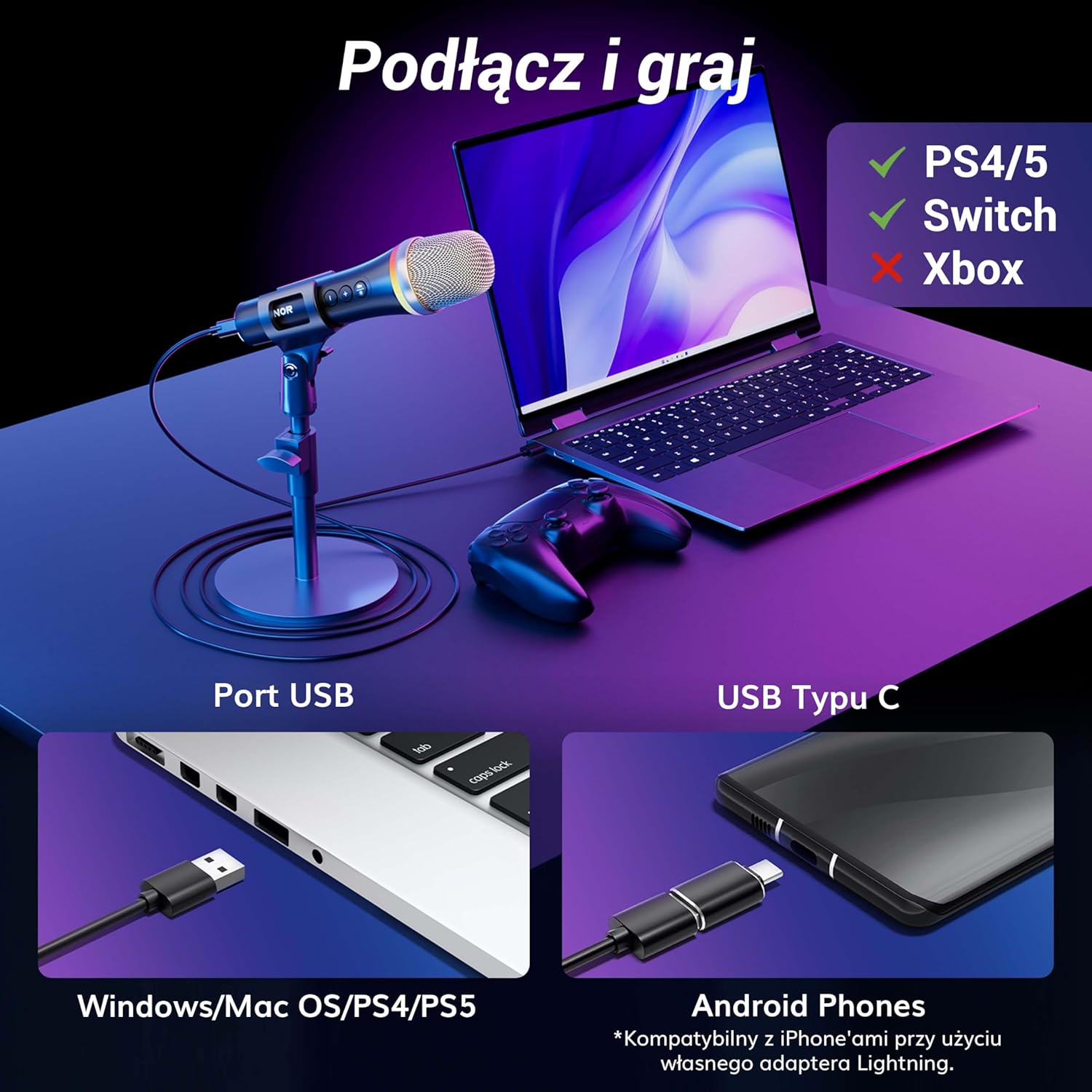 ✅ Funkcje specjalne: Oświetlenie RGB, wyciszenie jednym dotknięciem, dynamiczny mikrofon z adapterem USB/typ C
