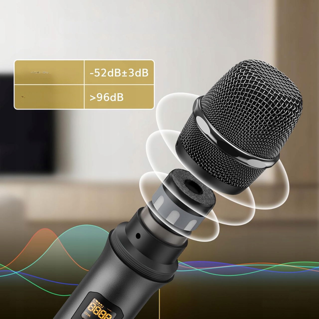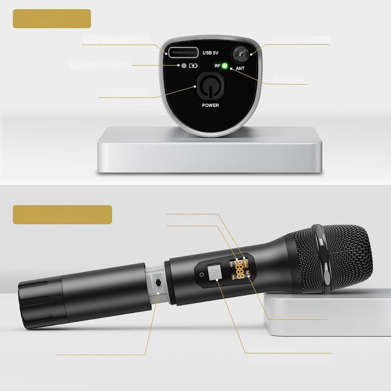 W zestawie znajdziesz wszystko, co niezbędne, aby zacząć działać od razu – mikrofony, odbiornik, osłony, pierścienie antypoślizgowe, kabel ładowania i instrukcję obsługi. Nie musisz kupować nic więcej – wystarczy rozpakować i działać. To również świetny pomysł na prezent dla każdego miłośnika muzyki, karaoke czy osób zajmujących się prowadzeniem wydarzeń.