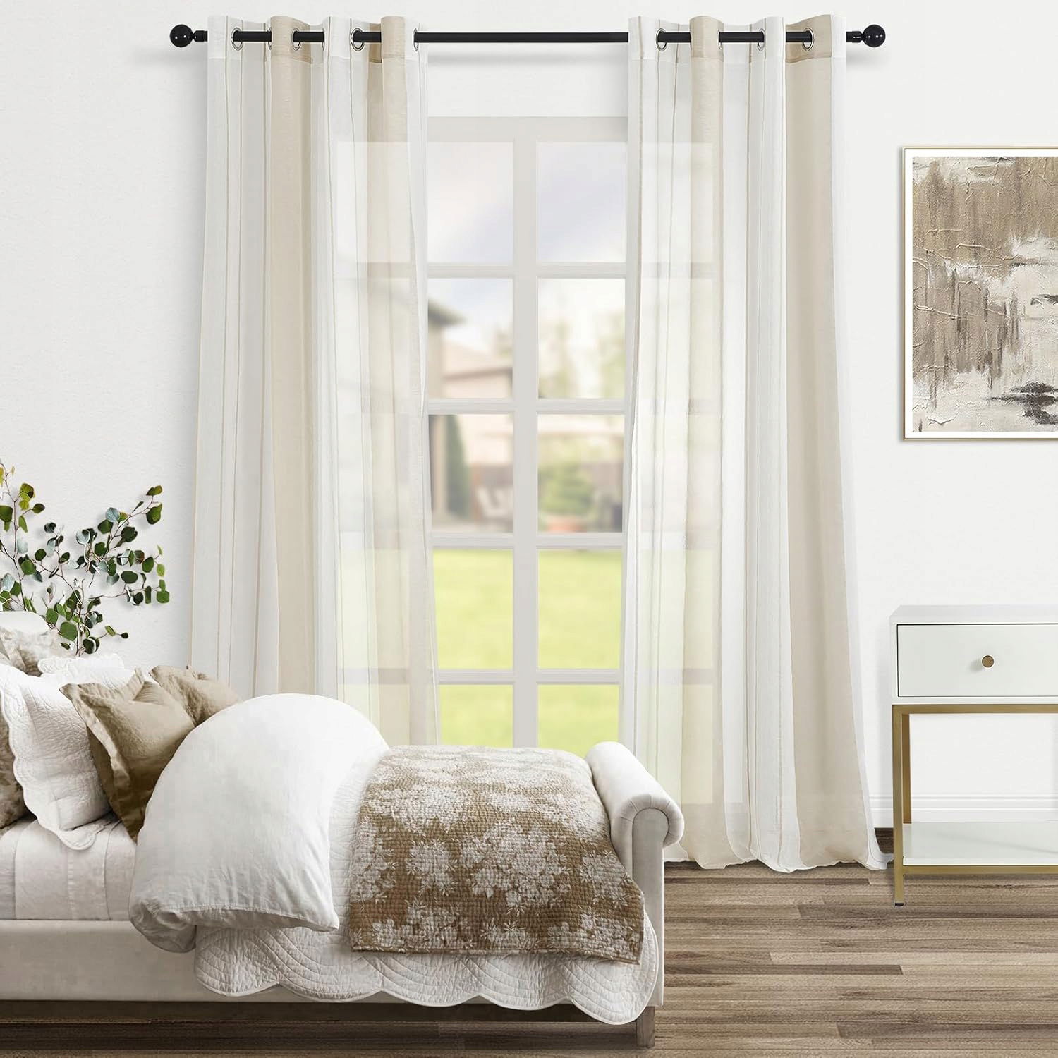 Materiał: Te półprzezroczyste zasłony są wykonane w 100% z wysokiej jakości poliestru, materiał pięknie się układa i nie wydziela nieprzyjemnego zapachu. Średnica metalowych oczek wynosi ok. 4 cm, trwałe, nierdzewne i nadają się do większości karniszy.