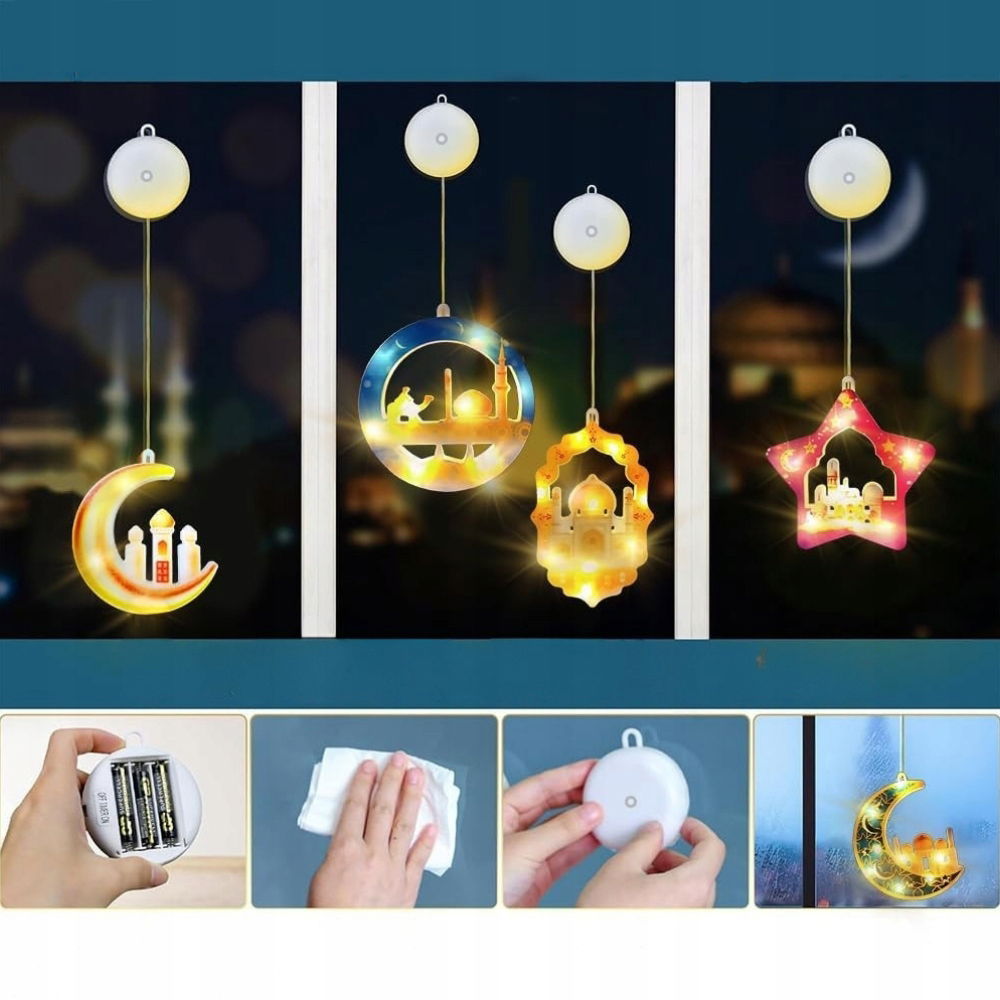 Otrzymujesz 5 lampek LED z muzułmańskimi wzorami, takimi jak półksiężyc, gwiazdy i napisy „Eid Mubarak” – każdy element starannie wykonany, by oddać duchowość i klimat święta. Idealne na Ramadan i Eid, ale również do użytku przez cały rok.