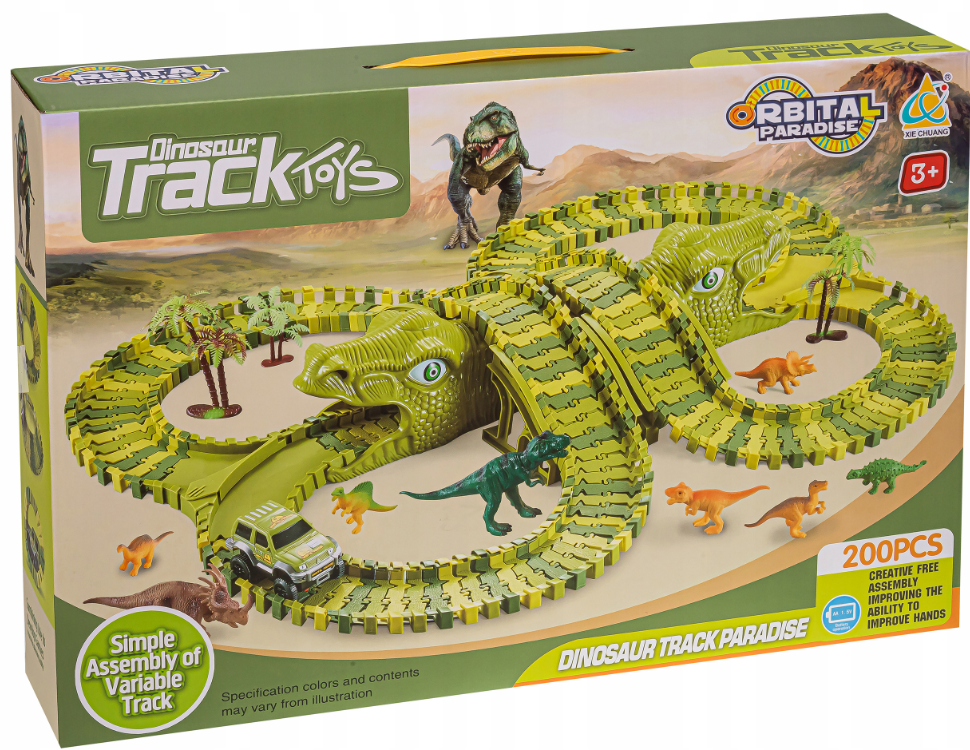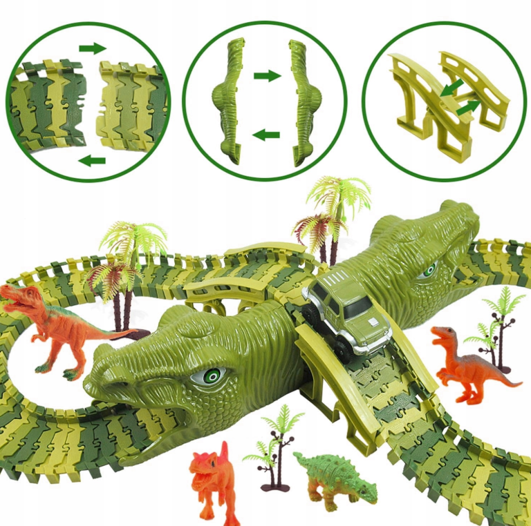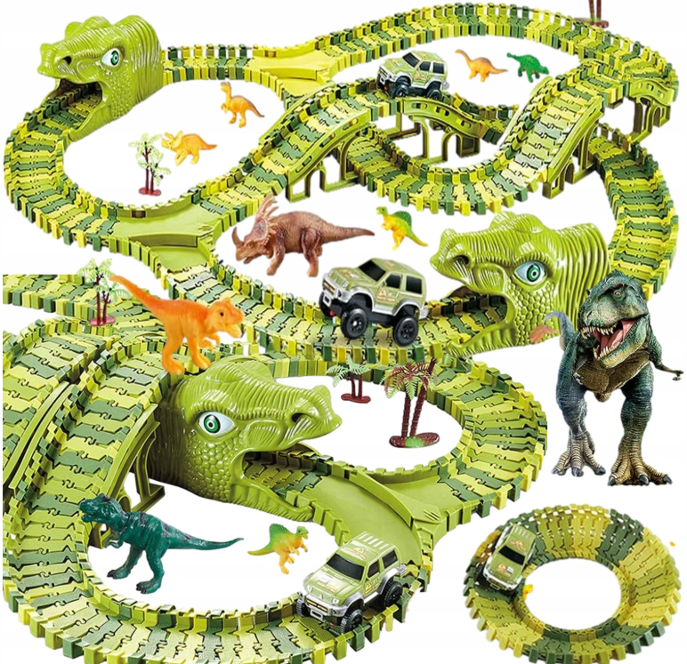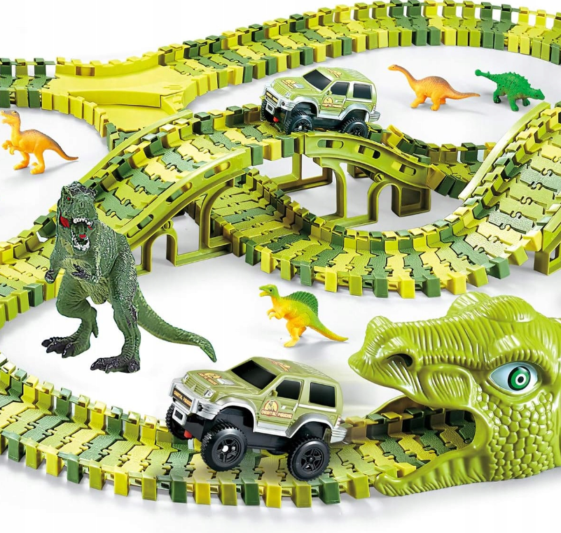 Przenieś się do niezwykłych czasów dinozaurów i odkryj przygodę, która zachwyci każde dziecko! Zestaw Dinosaur Track Toys składający się z aż 270 elementów to nie tylko zwykły tor wyścigowy – to kompletny świat zabawy, w którym spotykają się potężne prehistoryczne stworzenia i dynamiczne samochody terenowe. Kolorowe segmenty toru w odcieniach zieleni i żółci można dowolnie łączyć i wyginać, tworząc efektowne układy pełne zakrętów, mostów, podjazdów i zjazdów. Dzięki temu każde ułożenie staje się wyjątkowe i pozwala na wielogodzinne eksperymentowanie. Ten zestaw to doskonały wybór zarówno dla dzieci, które uwielbiają samochody, jak i dla małych fanów dinozaurów, bo łączy obie pasje w jednej, niezwykle angażującej zabawie.