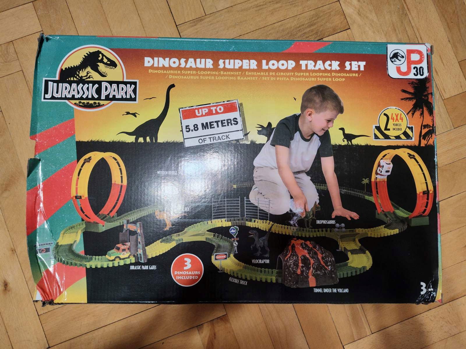 - Zawartość zestawu: 1 tor do zbudowania, 3 figurki dinozaurów, 2 pojazdy terenowe, wulkan z funkcją pary, akcesoria