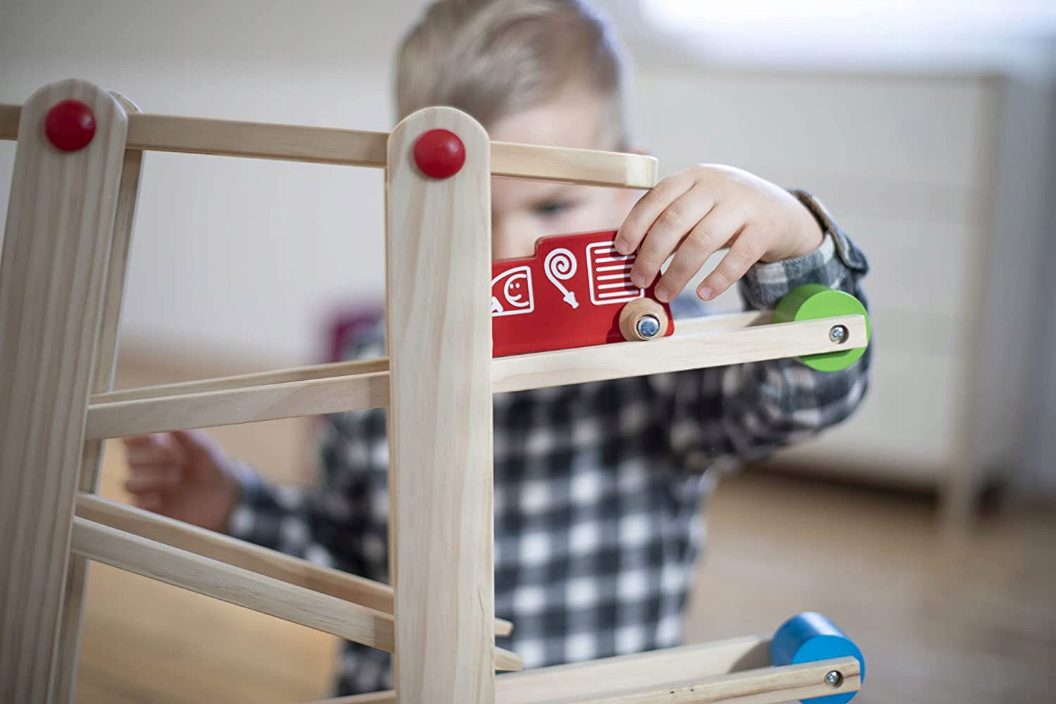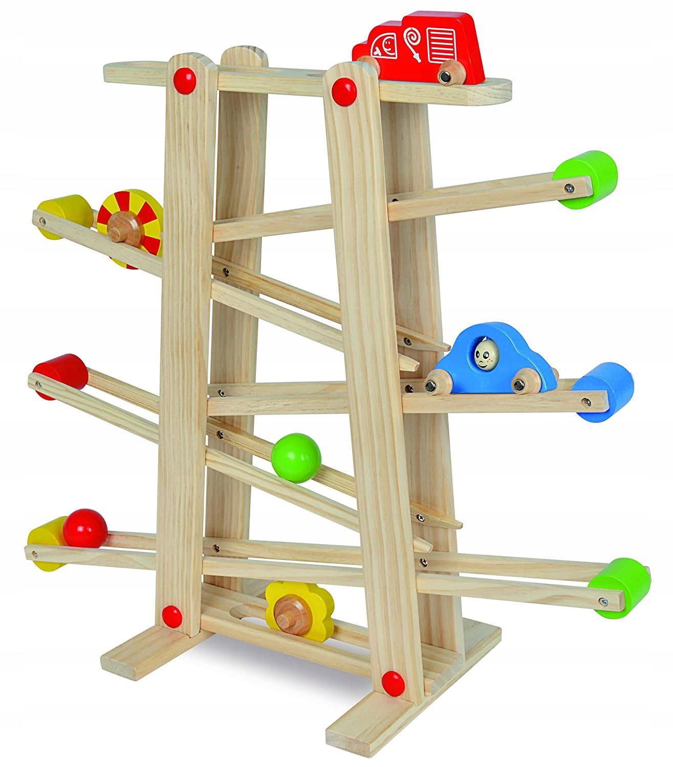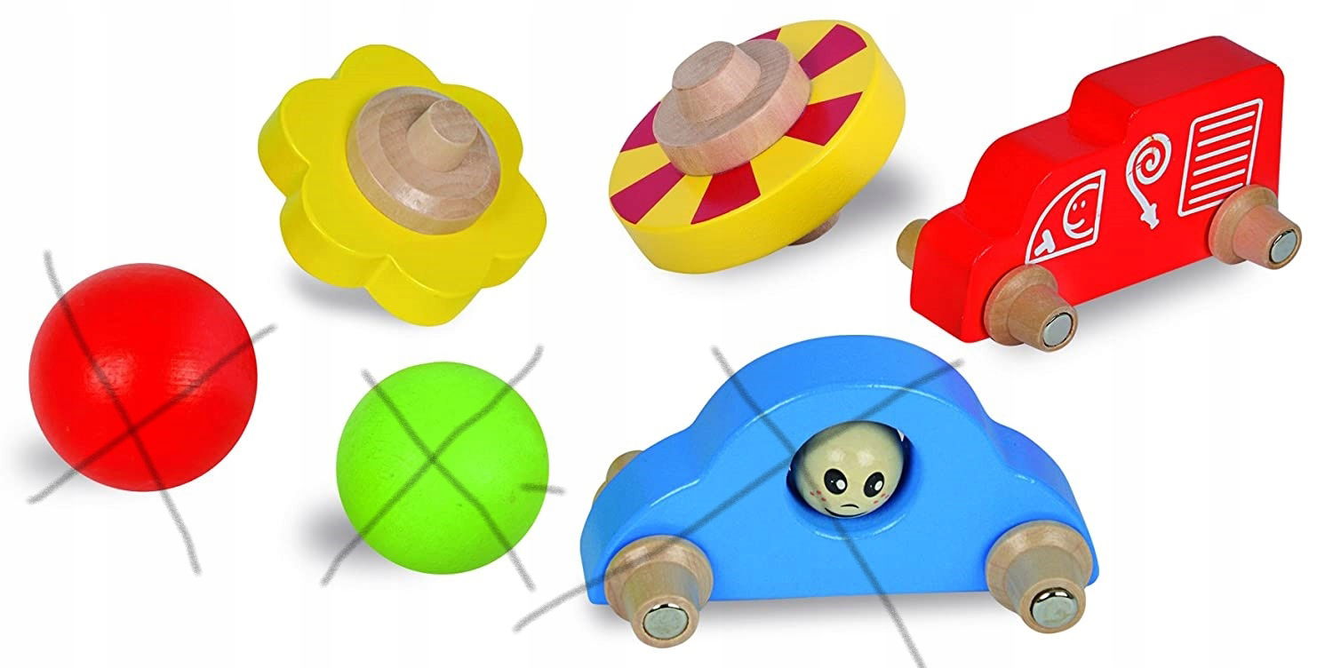 Drewniany tor samochodowy z pojazdami, piłkami i dyskami