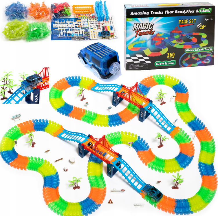 Zestaw zawiera aż 112 elementów, w tym kolorowe fragmenty toru i pojazd LED,