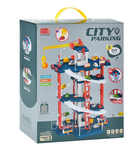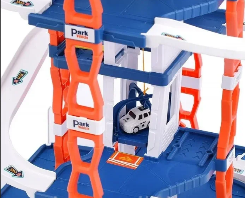 Zestaw wyposażony jest w ręczną windę, która pozwala dziecku wciągać samochodziki na wyższe poziomy parkingu. Dodatkowo: