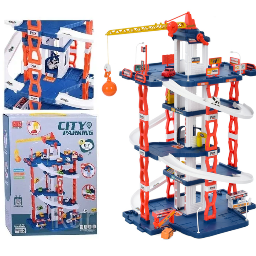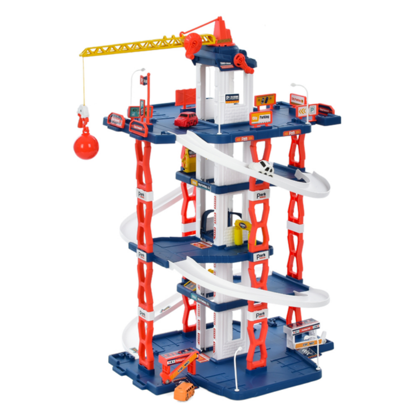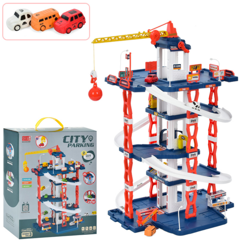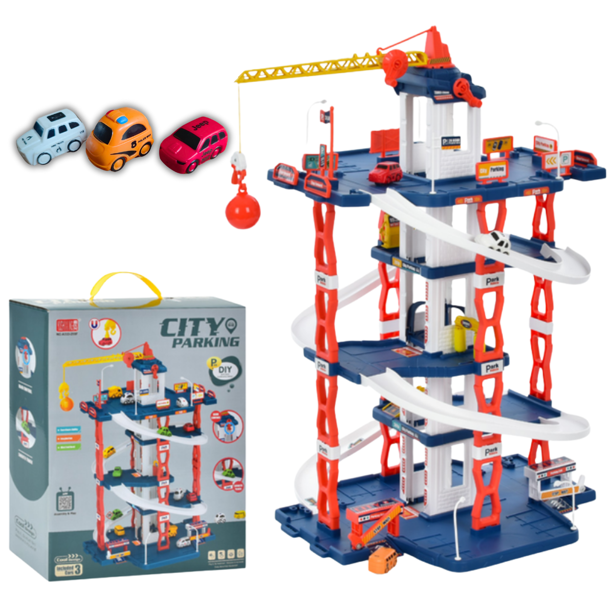 PARKING 5 POZIOMÓW – Zestaw dla dzieci z dźwigiem, windą i 3 samochodzikami
