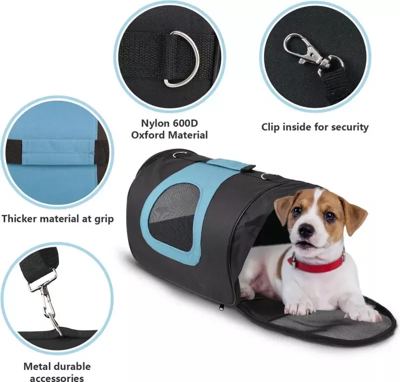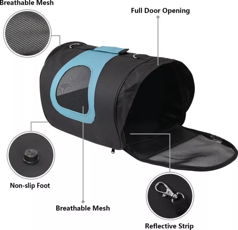 Torba podróżna dla zwierząt została zaprojektowana z myślą o wygodzie i bezpieczeństwie. Łatwa w montażu, system zamków błyskawicznych umożliwia otwieranie torby z obu stron. Siatkowe wstawki przednie i boczne zapewniają lepszą wentylację, co redukuje stres u psów i kotów podczas podróży. Dodatkowo, miękkie, wytrzymałe i odporne na zużycie dno, klamra do mocowania obroży skutecznie zabezpiecza zwierzę przed ucieczką po otwarciu. Torba wyposażona jest w cztery nóżki, które umożliwiają jej stabilne postawienie na ziemi, co zwiększa jej wytrzymałość i izoluje od podłoża. Poręczny uchwyt oraz dołączony pasek do przenoszenia sprawiają, że transport staje się jeszcze bardziej komfortowy. Cechy transportera: