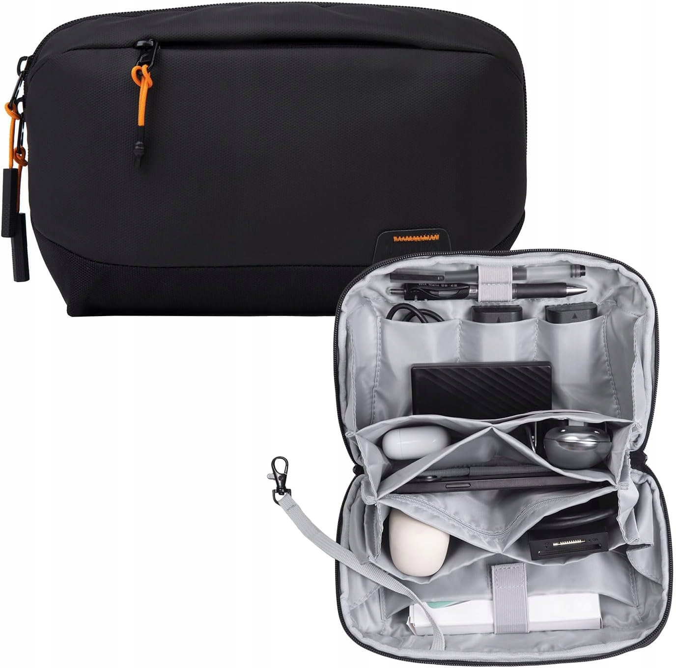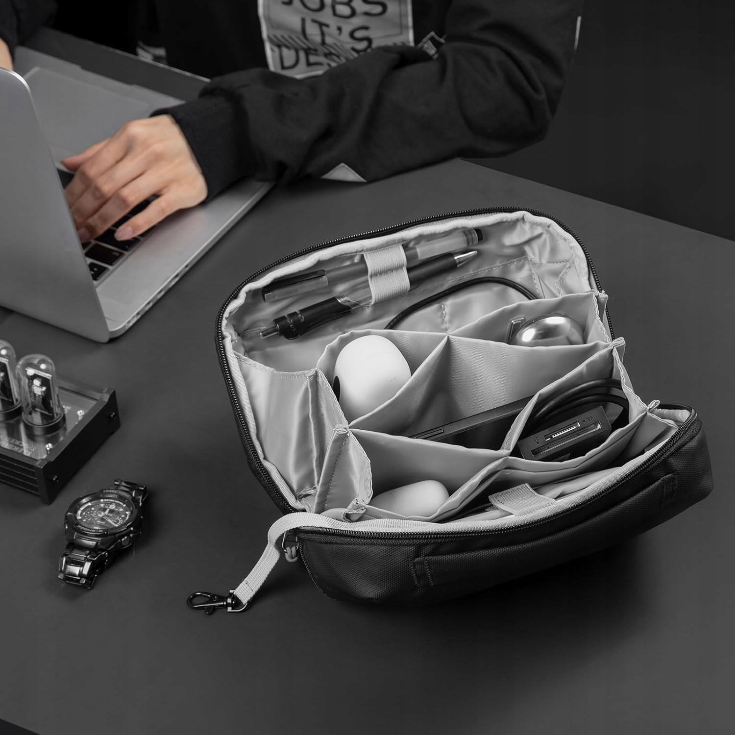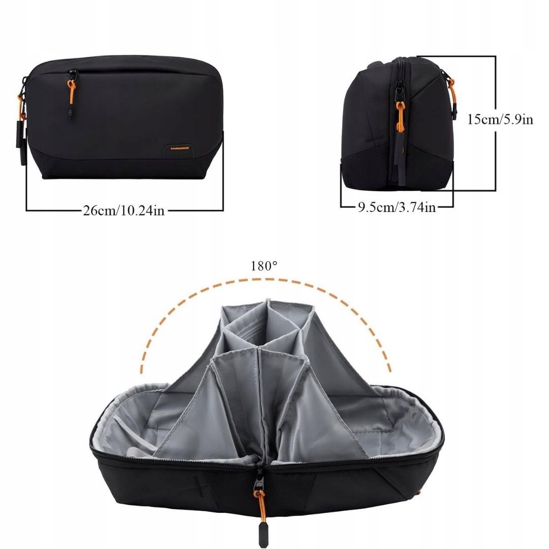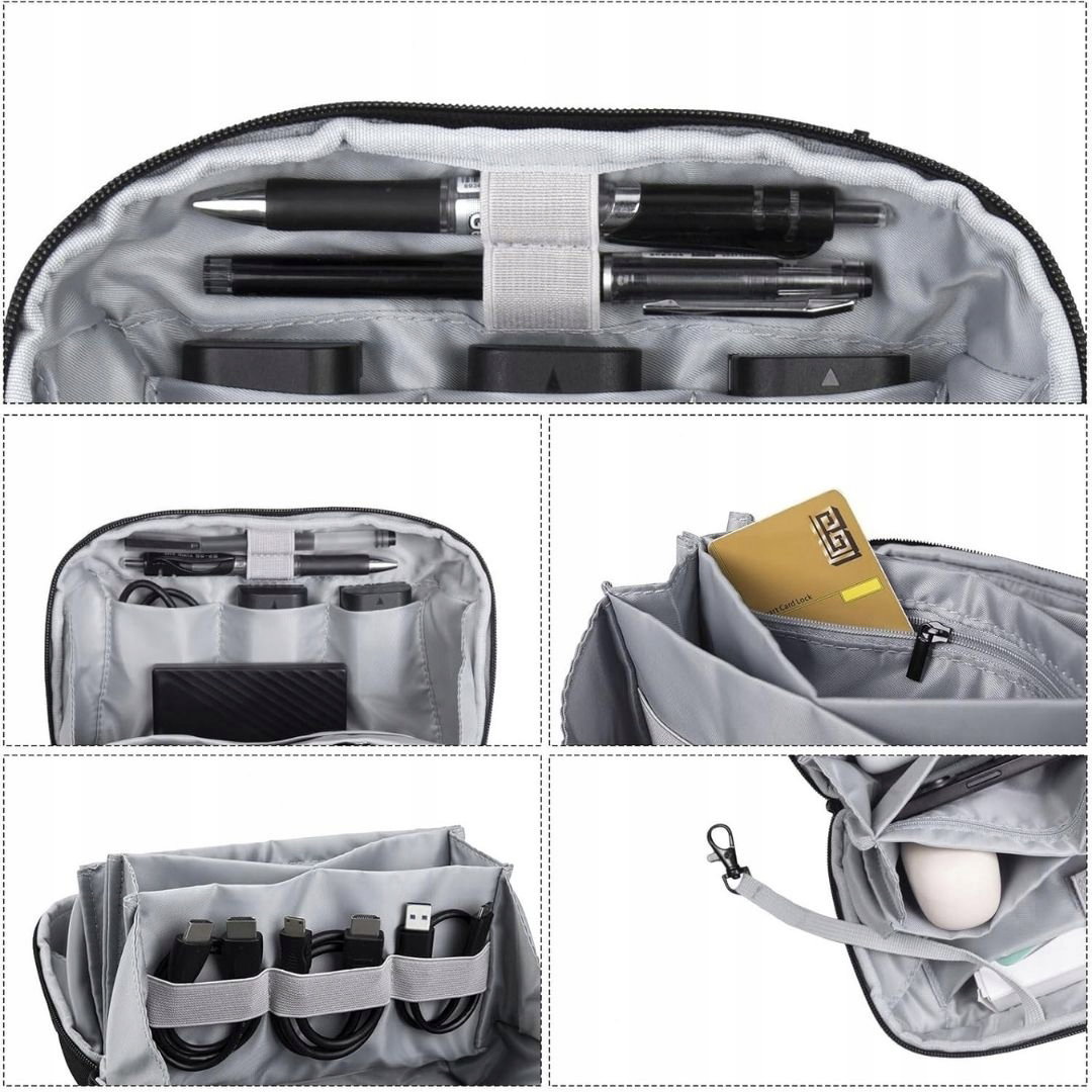 - Duża pojemność: organizer o wymiarach 26 cm × 9,5 cm × 15 cm otwiera się w pełnym kącie 180° i posiada przegrody, kieszenie na zamek, elastyczne uchwyty wewnątrz oraz dodatkowe kieszenie na powierzchni torby. Umożliwia przechowywanie kabli USB, ładowarek, powerbanków, kart SD, dysków twardych, myszek, słuchawek, kart i długopisów w jednym miejscu.