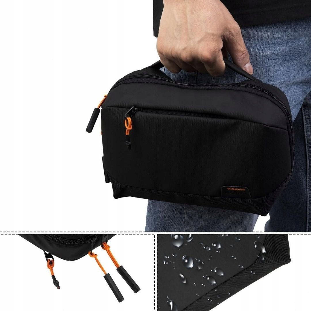 - Materiał premium: torba Tech Pouch charakteryzuje się eleganckim designem i klasycznym czarnym kolorem. Wyposażona w gładkie zamki YKK ułatwiające zamykanie, wykonana z materiału 210D Oxford i wodoodpornego, co zapewnia trwałość i ochronę przed zachlapaniem. Dodatkowo torba posiada uchwyt zabezpieczający przed przypadkowym upadkiem.