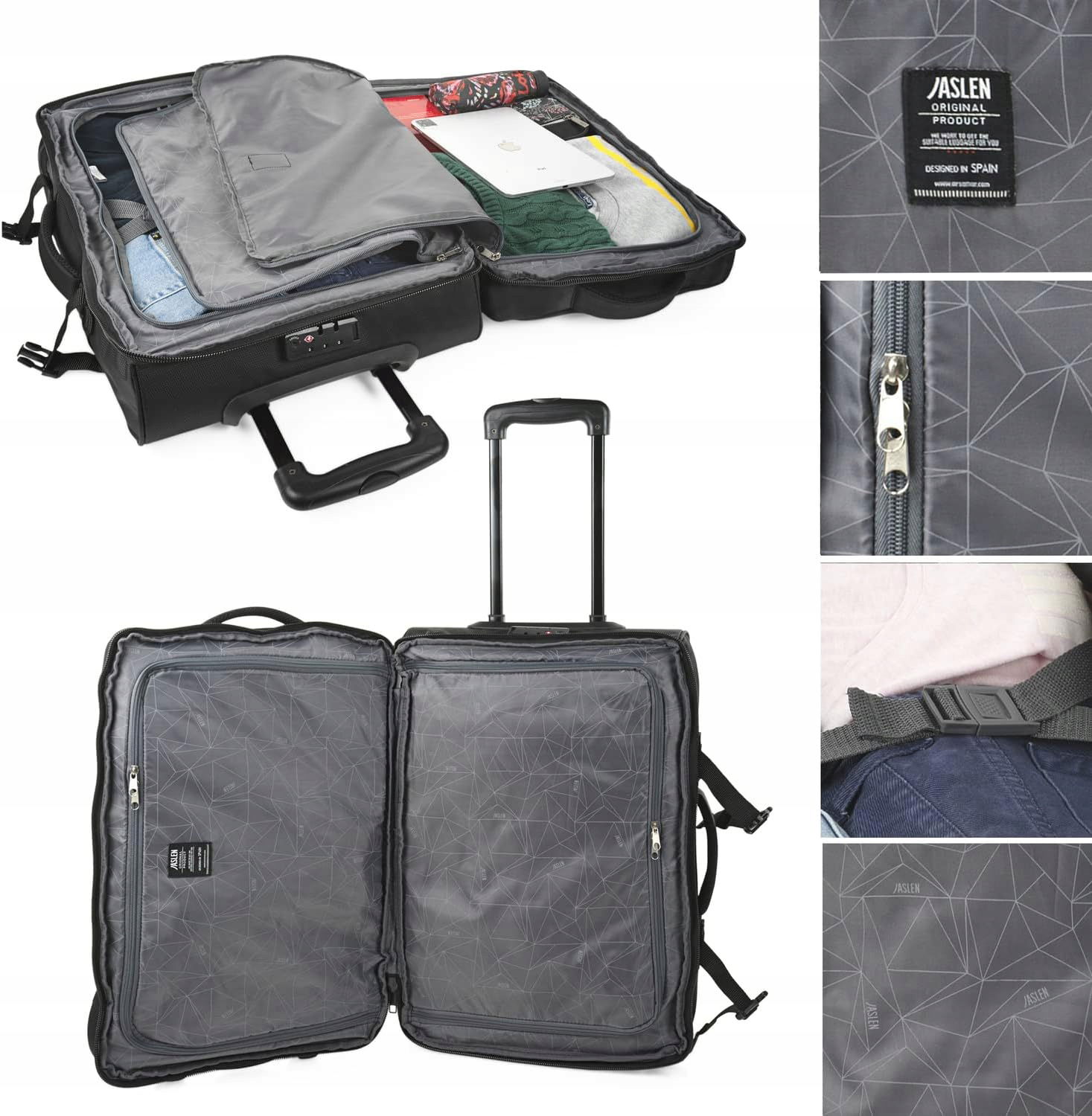 - Funkcje: kształt torby podróżnej kryje w sobie wnętrze typowe dla walizek podróżnych (z podziałem na 2 komory zasuwane na suwaki; jedna komora posiada standardowy walizkowy krzyżak z gumy); 2 kauczukowe kółka+ podpórki z solidnej gumy; możliwość prowadzenia na kółkach korzystając z wysuwanej rączki lub też niesienia w ręku w poziomie; 2 pojemne zewnętrzne kieszenie na suwak; główne zapięcie stanowi 2-stronny solidny suwak, którego końcówki wpinane są do zamka szyfrowanego; po całkowitym odsunięciu suwaków otwiera się jak standardowa walizka (na dwie połowy)