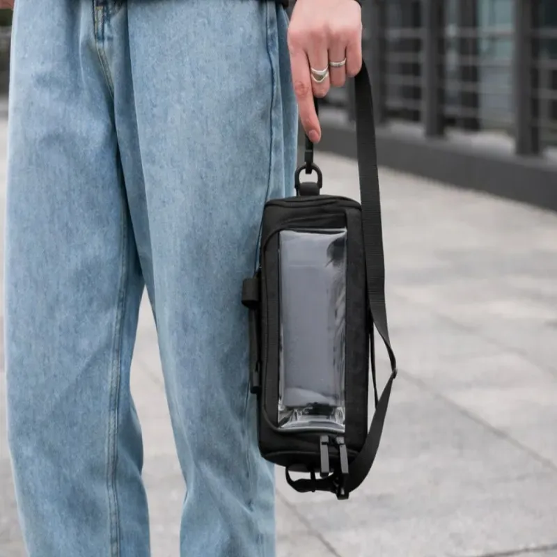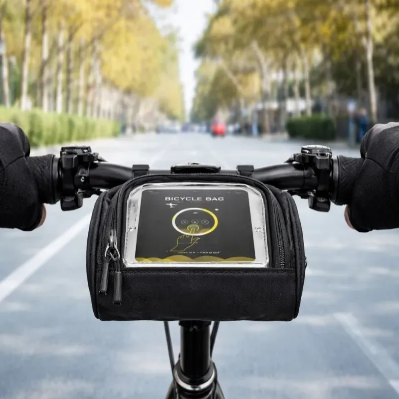 Funkcjonalna torba rowerowa montowana na kierownicy to wygodne rozwiązanie do przechowywania najważniejszych rzeczy podczas jazdy. Dzięki przezroczystemu okienku na górze można wygodnie umieścić telefon i korzystać z nawigacji lub aplikacji bez konieczności wyjmowania urządzenia z torby.