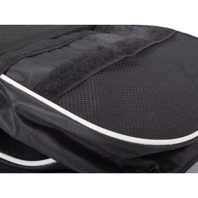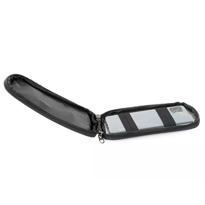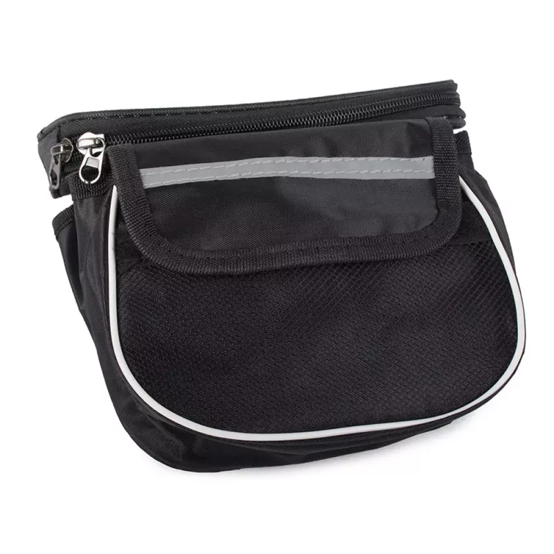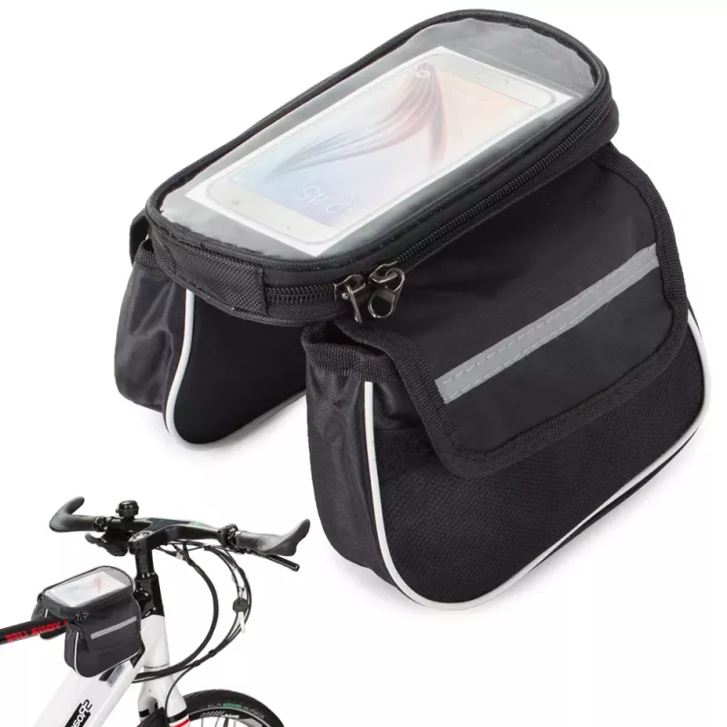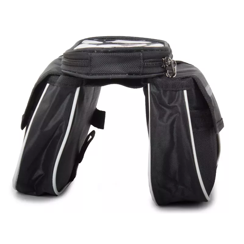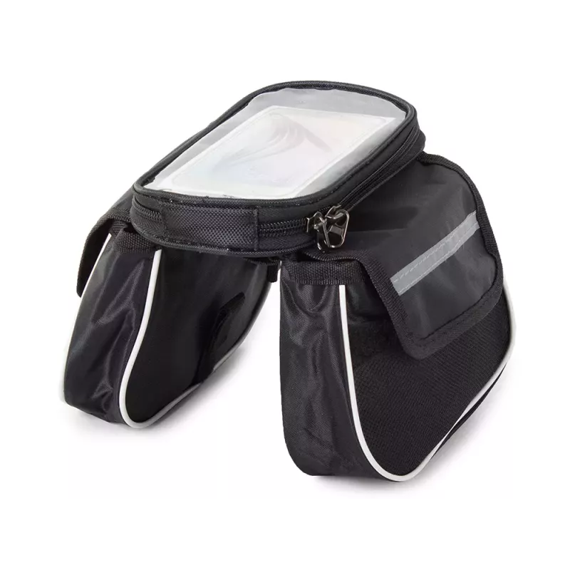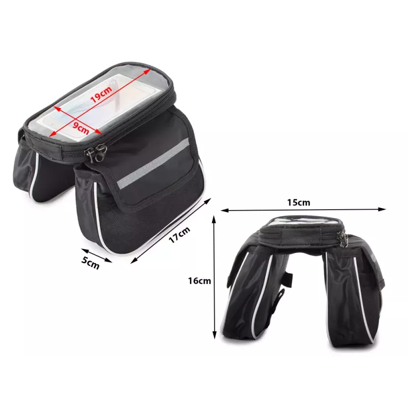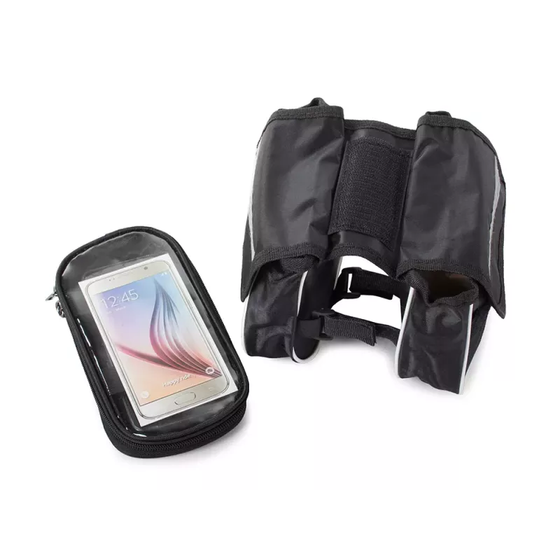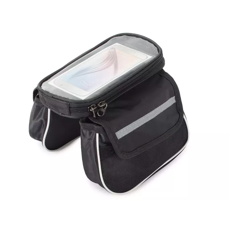 Wykonana z wytrzymałego materiału. Wygodna w użyciu, pozwala na bezproblemowe korzystanie ze wszystkich funkcji telefonu podczas jazdy na rowerze. Montowana jest do ramy roweru na regulowane rzepy. Zmieszczą się w niej urządzenia o przekątnej max. 7,2'' Torba składa się z dwóch części zapinanych na rzepy, dodatkowo posiadają po dwie kieszonki wykonane z siatki. Na łączniku znajduje się kieszonka na telefon, zapinana na podwójny zamek błyskawiczny. Można ją łatwo zdemontować ponieważ przyczepiana jest na rzep.