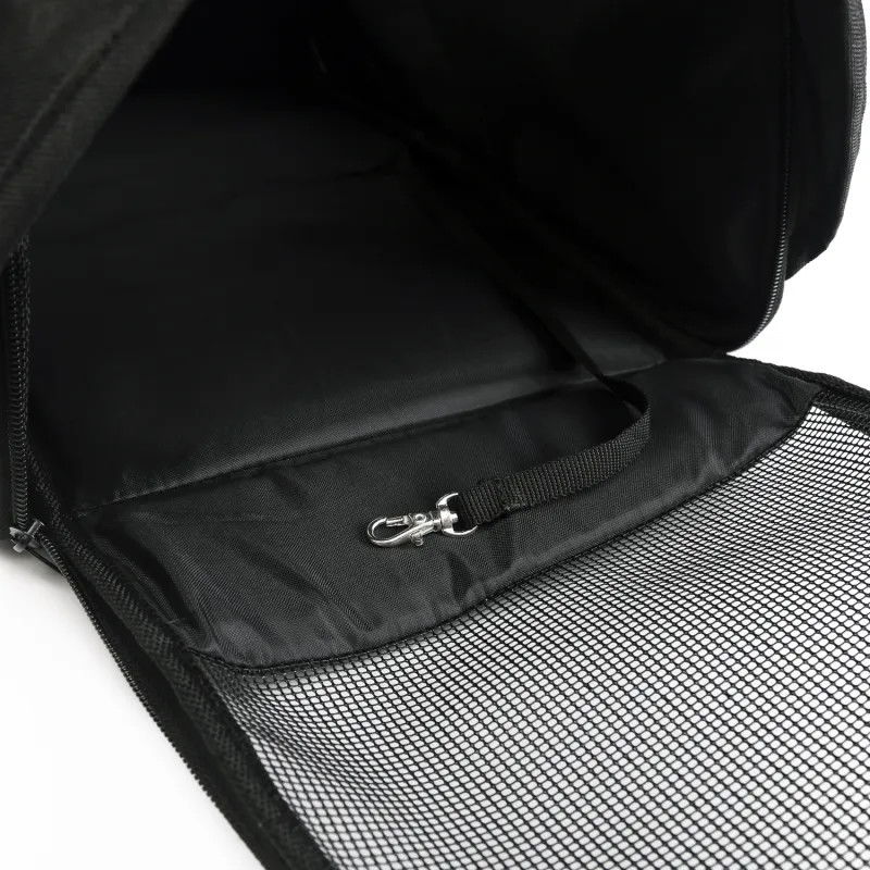 - Klamra wewnątrz torby umożliwia zapięcie obroży zwierzęcia aby nie uciekło w skutek paniki. Jest to przydatne gdy chcemy otworzyć torbę i podać karmę, napój czy pogłaskać etc... ale istnieje ryzyko że nasz pupil ze strachu czy ciekawości gdzieś nam ucieknie.