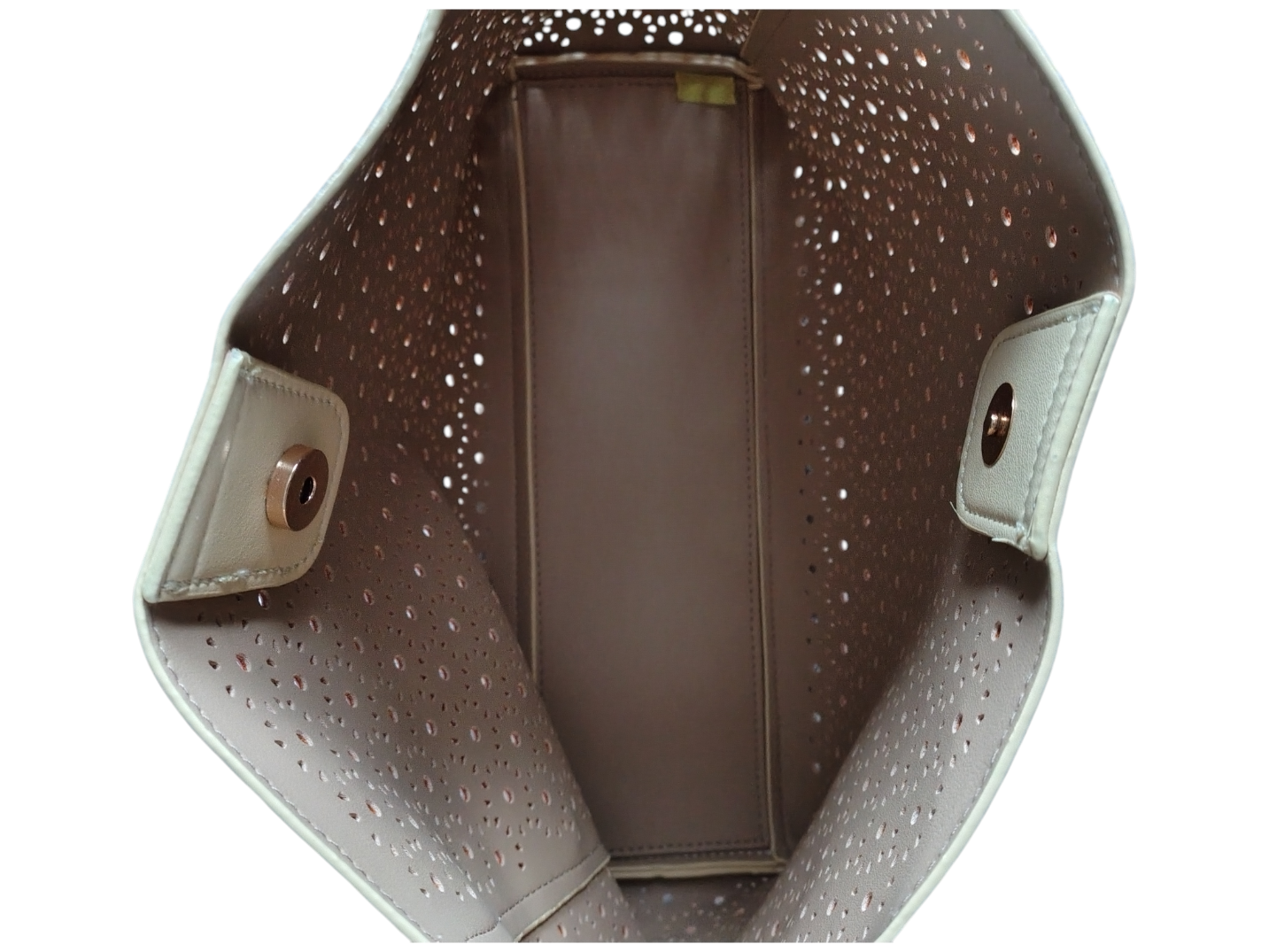 Informacja o Bespieczeństwie: Torebka do użytku codziennego. Nieodpowiednia dla dzieci – ryzyko uduszenia / skaleczenia małymi elementami i paskami. Używać zgodnie z przeznaczeniem. Nie przeciążać. Trzymać z dala od ognia i wysokiej temperatury. Czyszczenie wilgotną miękką ściereczką; nie prać; nie używać rozpuszczalników
