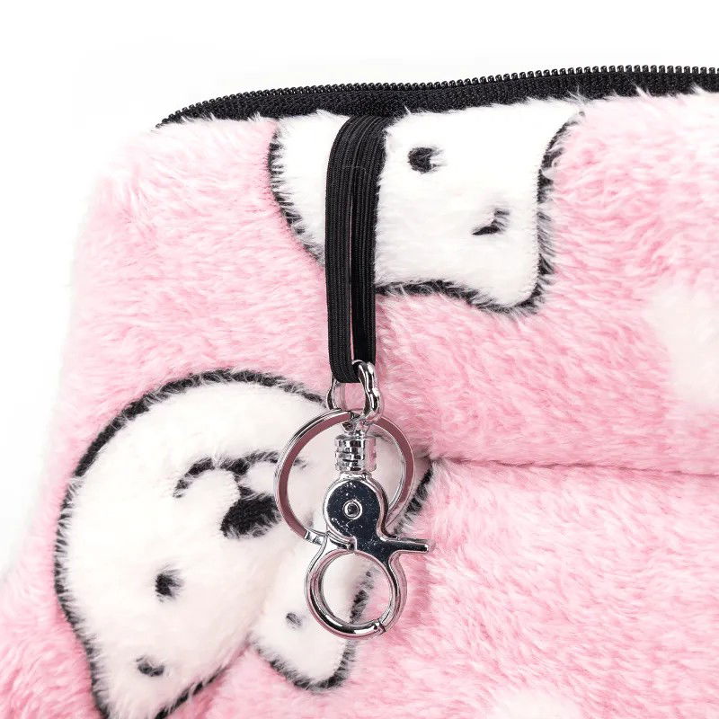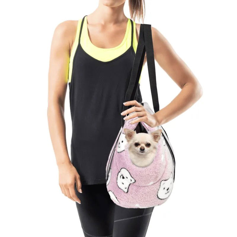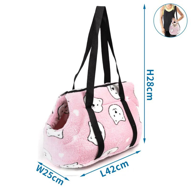 Puszysta torba podróżna dla zwierząt różowa w białe kocie mordki, którą można nosić na ramieniu lub w ręce, łatwa w użyciu.