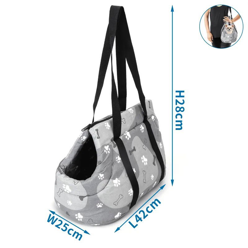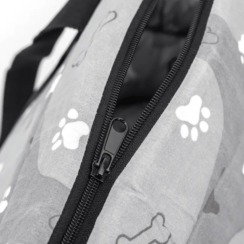 Torba podróżna dla zwierząt szara w białe łapki, którą można nosić na ramieniu lub w ręce, łatwa w użyciu.
