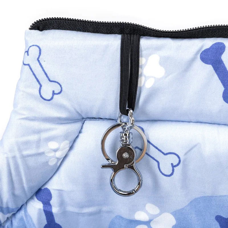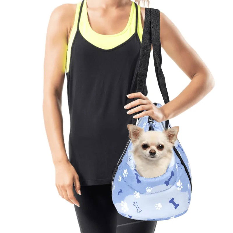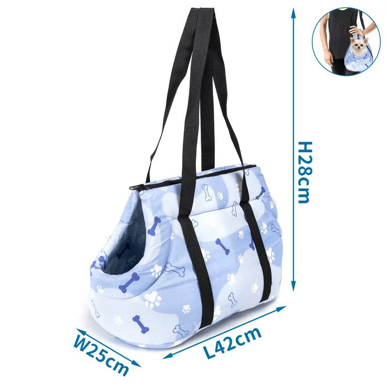 Torba podróżna dla zwierząt błękitna w białe łapki, którą można nosić na ramieniu lub w ręce, łatwa w użyciu.