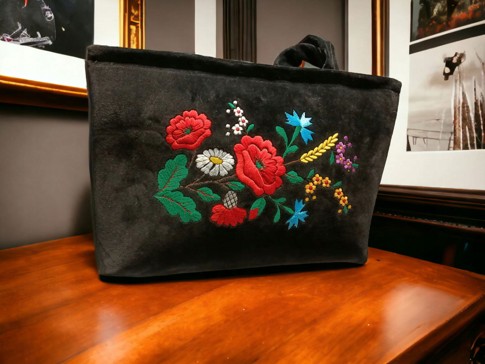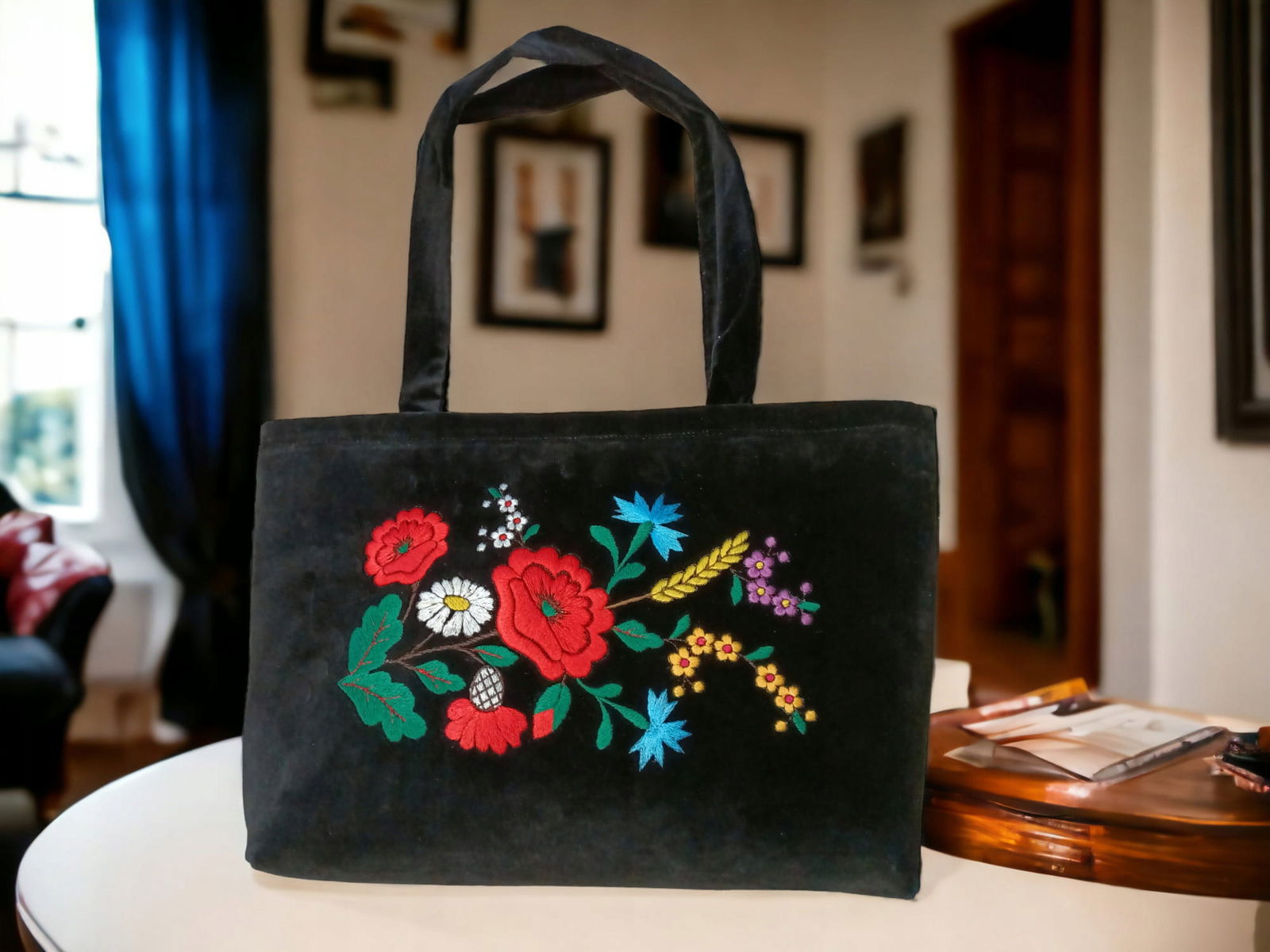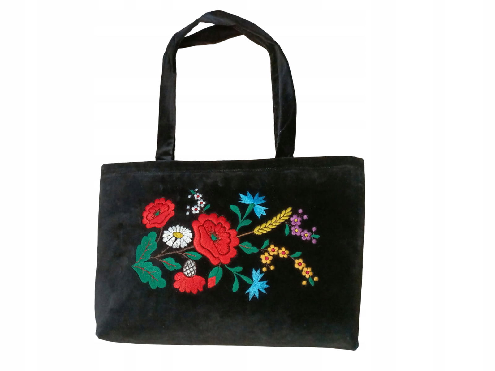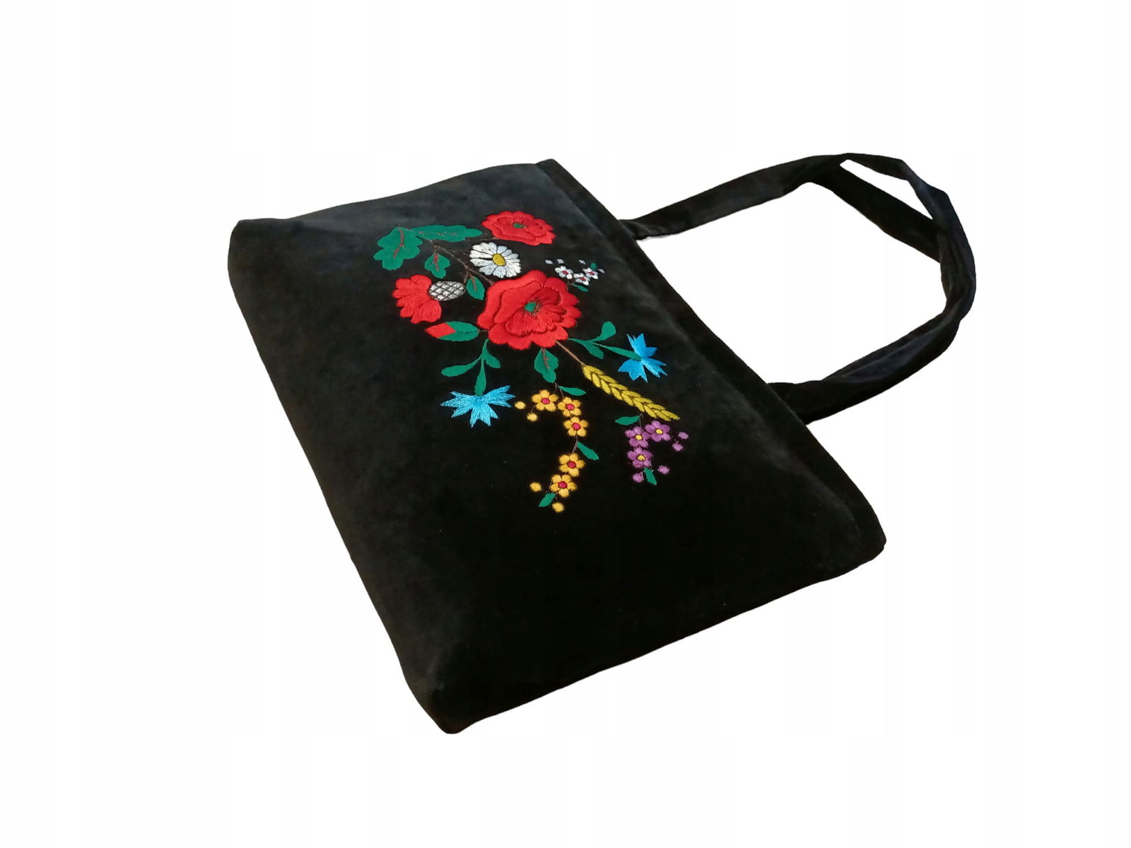 Torebka haftowana na ramię, wykonana w stylu haftu kociewskiego. Ta elegancka czarna torebka wyróżnia się pięknymi wzorami haftu, w tym makami, kłosami, chabrami i margaretkami, które dodają jej uroku i wyjątkowości.