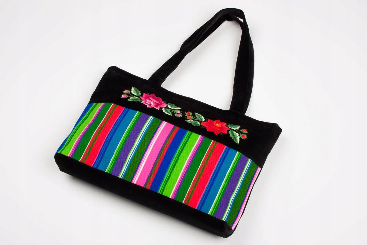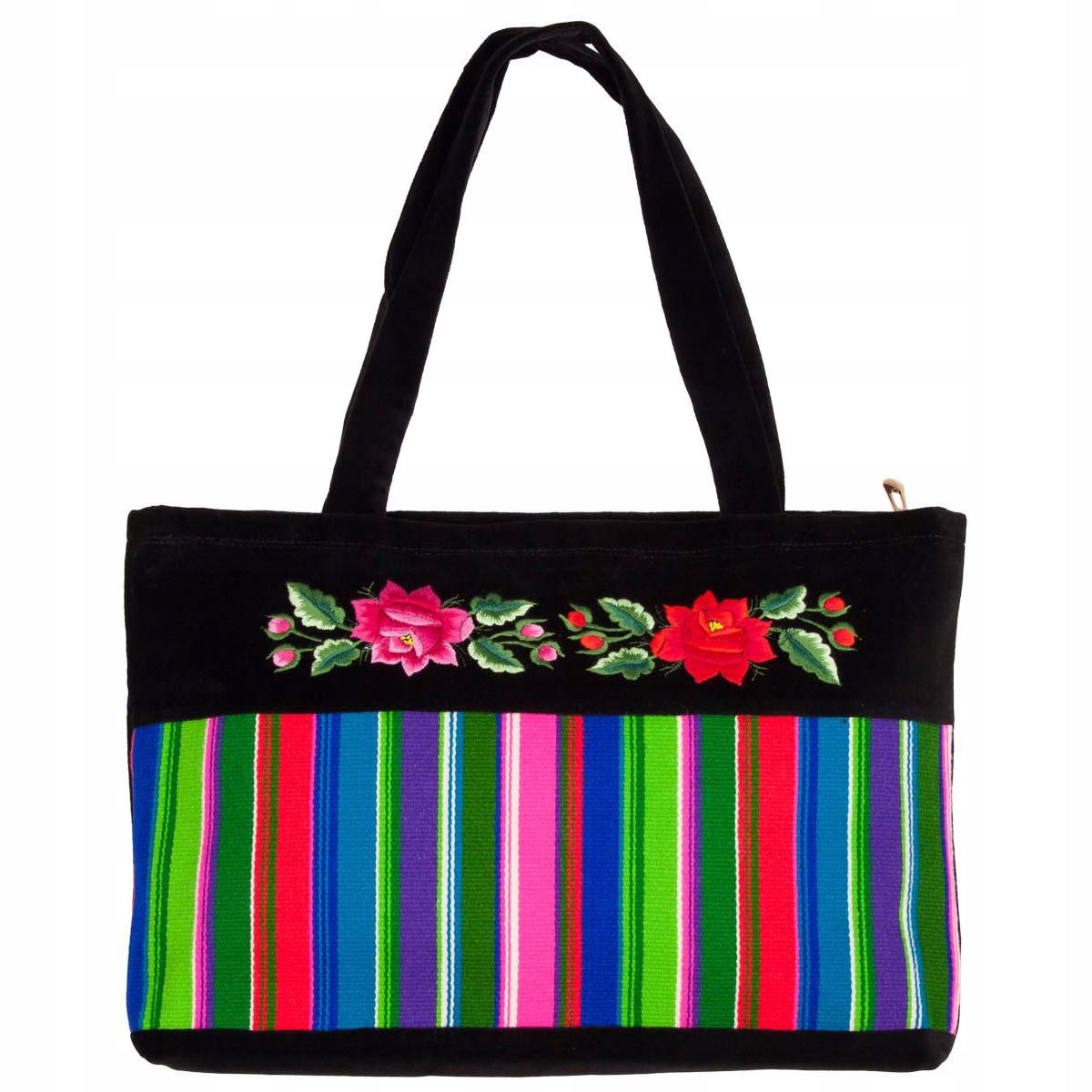 Elegancka i przykuwająca wzrok torebka z haftowanym pasiakiem oraz z czerwoną i różową różą sprawdzi się zarówno na co dzień do pracy czy szkoły jak również na wielkie wyjścia. Prosta stylizacja połączona z taką torebką będzie wyglądała bardzo oryginalnie i każdy zwróci uwagę na Twój dodatek