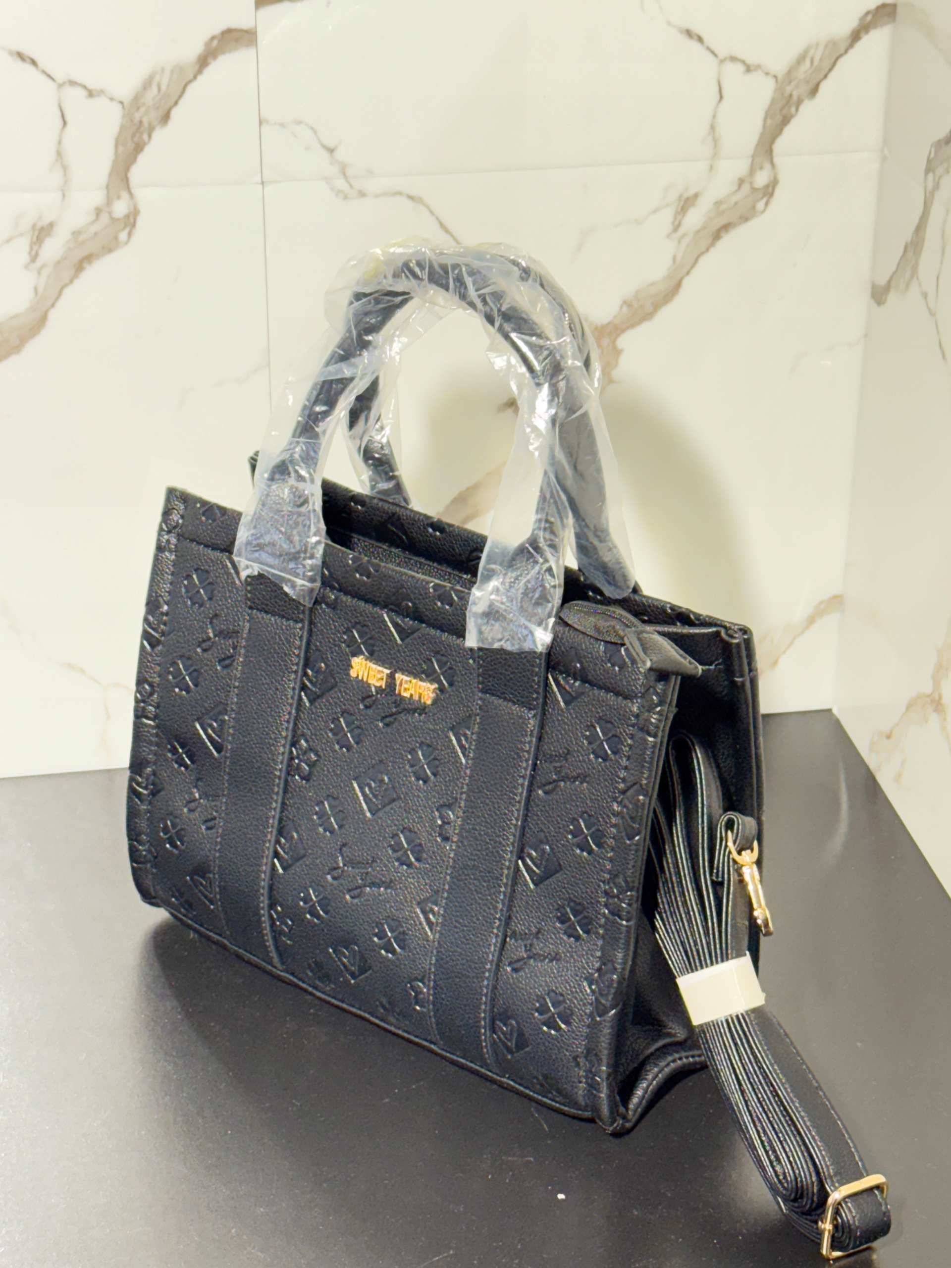 Elegancka i praktyczna torebka damska w kolorze czarnym od marki Sweet Years. Wykonana z wysokiej jakości skóry ekologicznej z tłoczonym wzorem w serca i motywy geometryczne. Idealna na co dzień, do pracy, na spotkania czy wyjścia ze znajomymi.