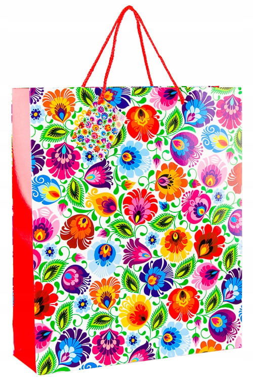 Wielka torebka prezentowa z wzorami ludowymi inspirowanymi wycinanką łowicką.