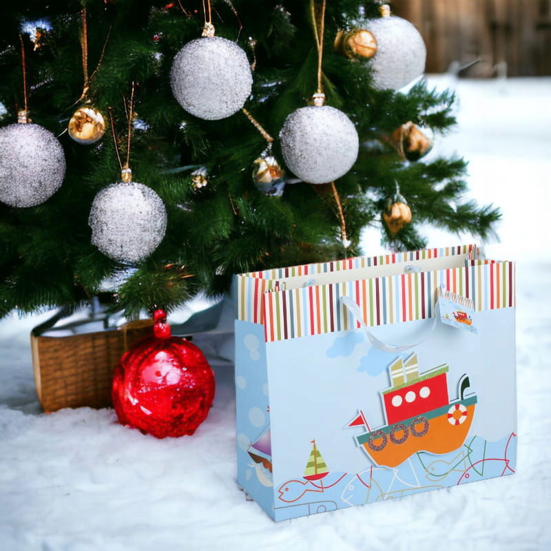Daj swoim prezentom dodatkowy urok i zamień zwykłe wręczenie upominku w magiczne przeżycie dzięki naszej średniej ozdobnej torebce z wzorem statku. To nie tylko praktyczne opakowanie, ale również uroczy dodatek, który wzbogaci każdy prezentowany podarunek.