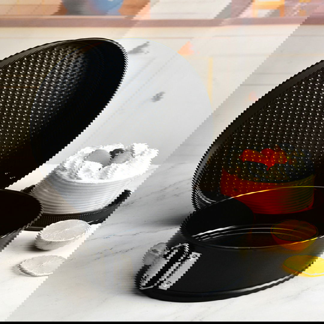Formy pokryte powłoką nieprzywieralną, która ułatwia pieczenie Łatwe do umycia, zalecane mycie ręczne Należy pamiętać o nie stosowaniu ostrych przyborów aby zapobiec zarysowaniom na powłoce nieprzywieralnej. Otwierane ranty ułatwiają wyjęcie gotowego wypieku. Zestaw idealny do pieczenia tortów piętrowych.