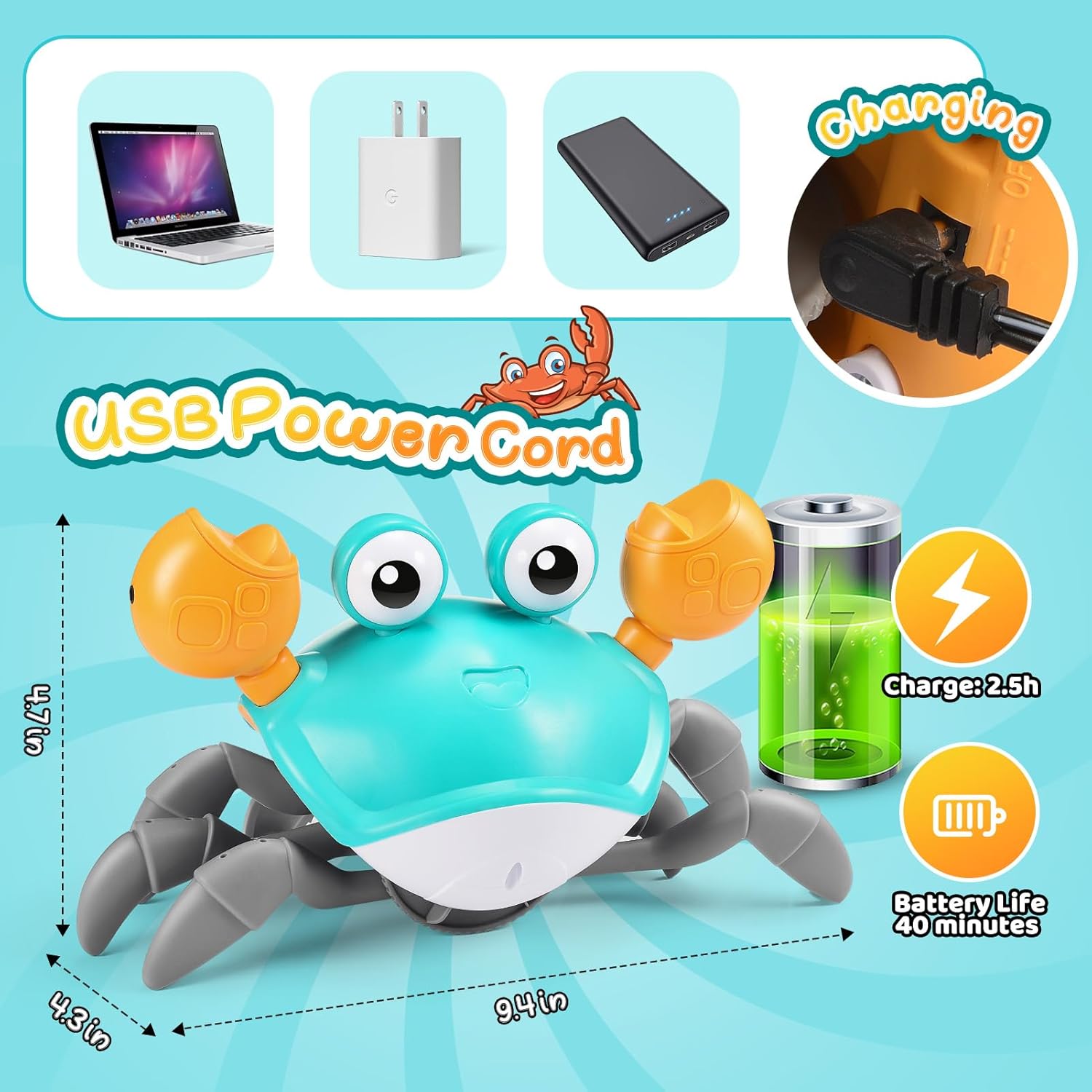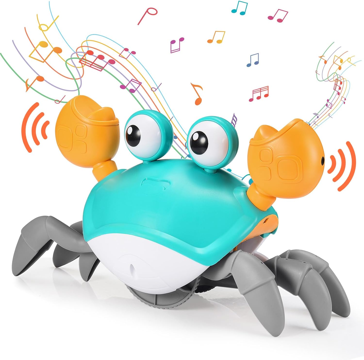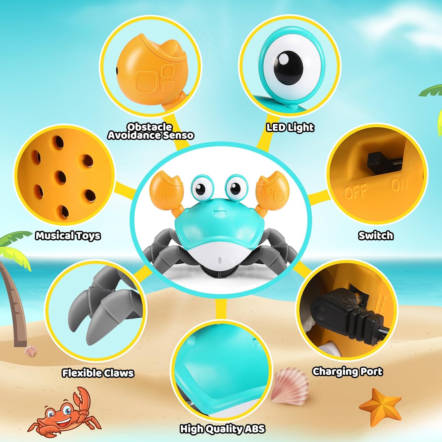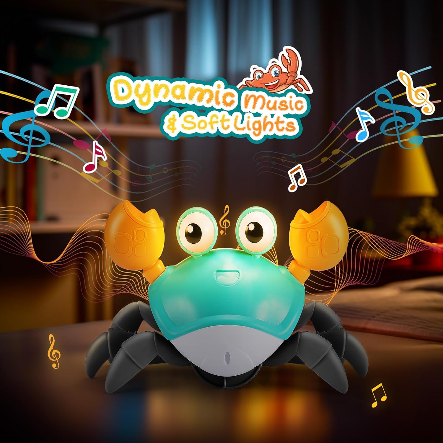 zabawka kraba jest w jaskrawych kolorach, wytwarza dynamiczną muzykę podczas ruchu, a jej oczy świecą