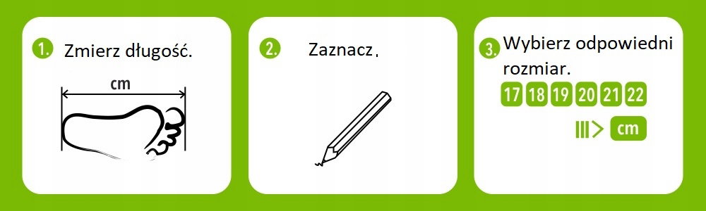 Długość bieżnika wewnętrznego zwiększa się o 12 mm (dla butów zamkniętych) i 6 mm (dla butów otwartych), co jest wymagane dla zdrowego wzrostu i rozwoju stopy. Najłatwiejszym sposobem określenia długości stopy jest narysowanie konturu stopy na czystej kartce papieru (pozwól dziecku stać). Wybierz rozmiar, który dokładnie lub jak najbardziej odpowiada zmierzonej długości stopy.
