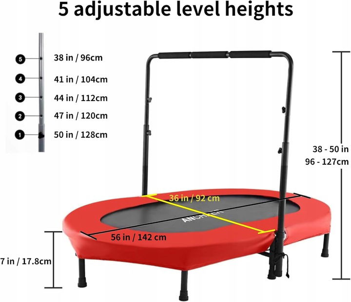 Regulowany uchwyt: 5 wysokości uchwytu z regulacją wysokości dla różnych potrzeb wiekowych dzieci do skakania w różnych pozycjach.