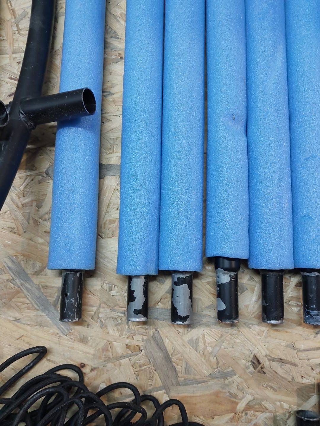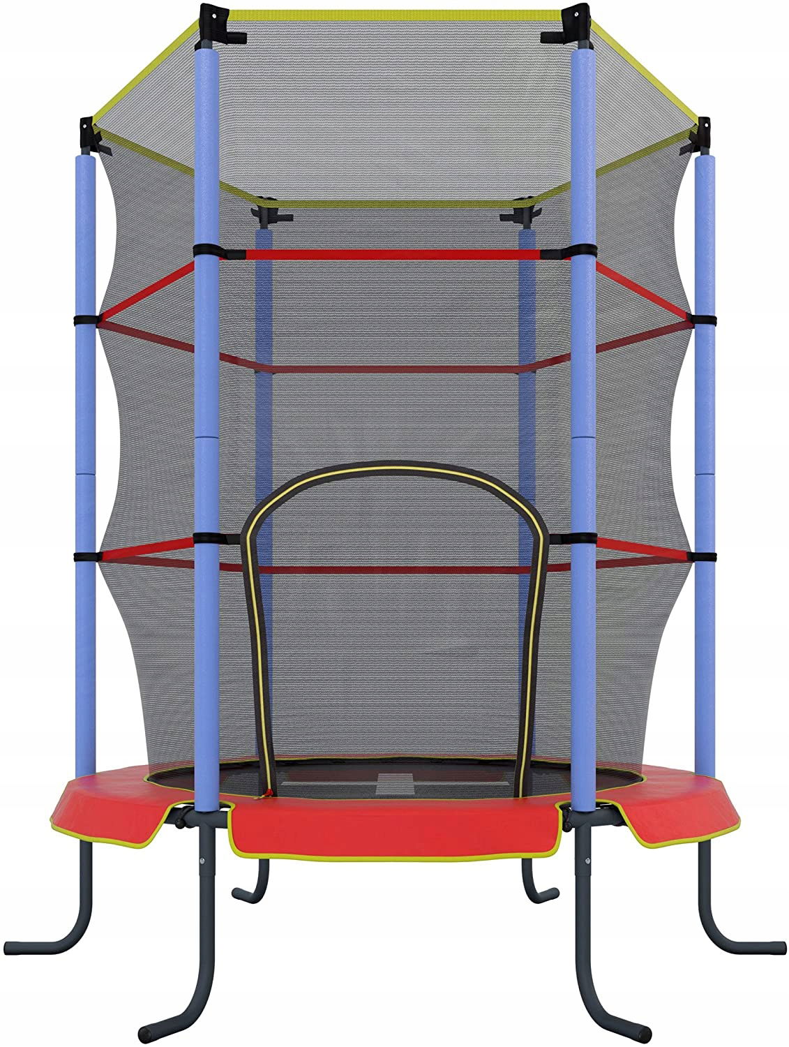 Trampolina jest oparta na sześciu stopach zapewniających stabilność i ma sześć stalowych ocynkowanych rur, które są pokryte miękką piankę w obszarze siatki ochronnej.