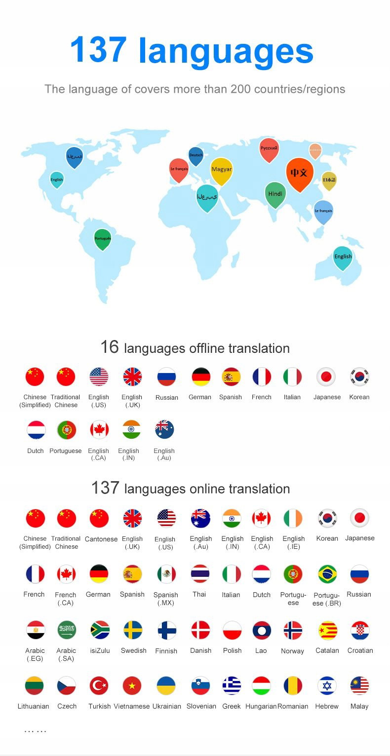 Oferuje tłumaczenie online w 137 językach oraz translację zdjęć na 44 języki. Możesz również przeprowadzać tłumaczenia osobiste poprzez połączenie z Wi-Fi lub hotspotem, co jest bardziej precyzyjne i wygodniejsze niż aplikacje mobilne. Dokładność tłumaczenia online wynosi 95% w przypadku codziennych krótkich rozmów.