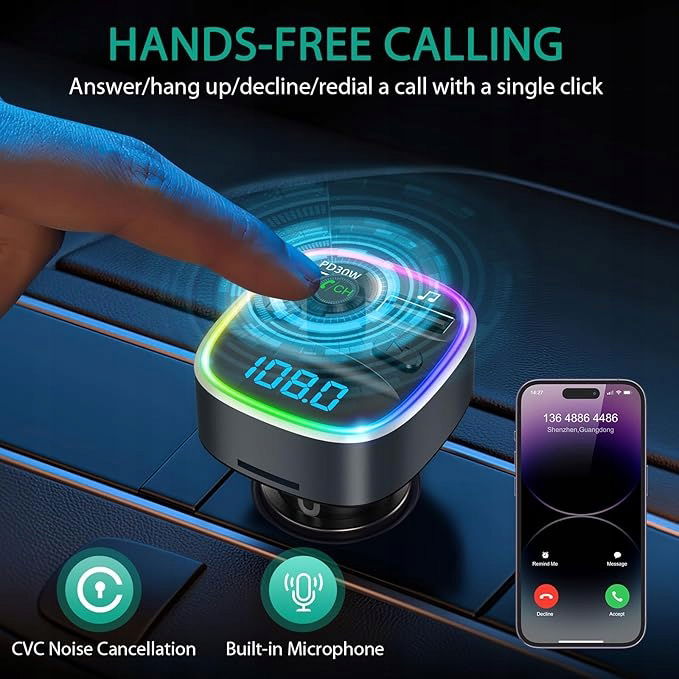 Transmiter FM ORIA Bluetooth 5.3 30W USB-C LED RGB Zestaw BT