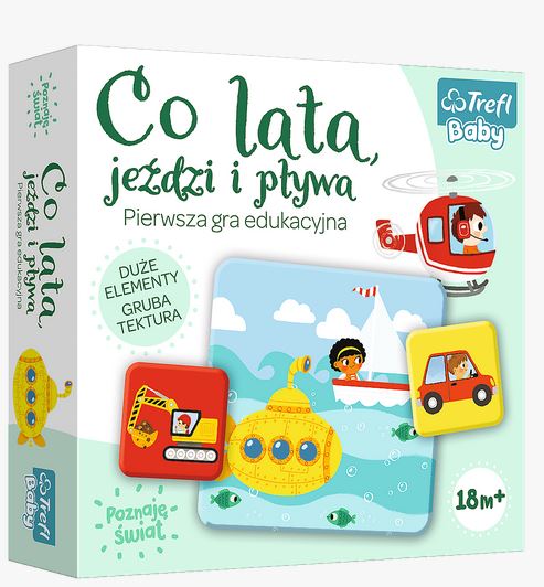 Co lata, jeździ i pływa to edukacyjna loteryjka, dzięki której maluch poznaje różne pojazdy i uczy się przyporządkowywać je do miejsc, w których możemy je spotkać. Przewodnik dla rodziców zawiera propozycje gier i zabaw.